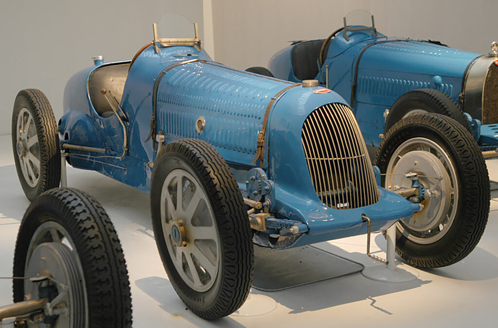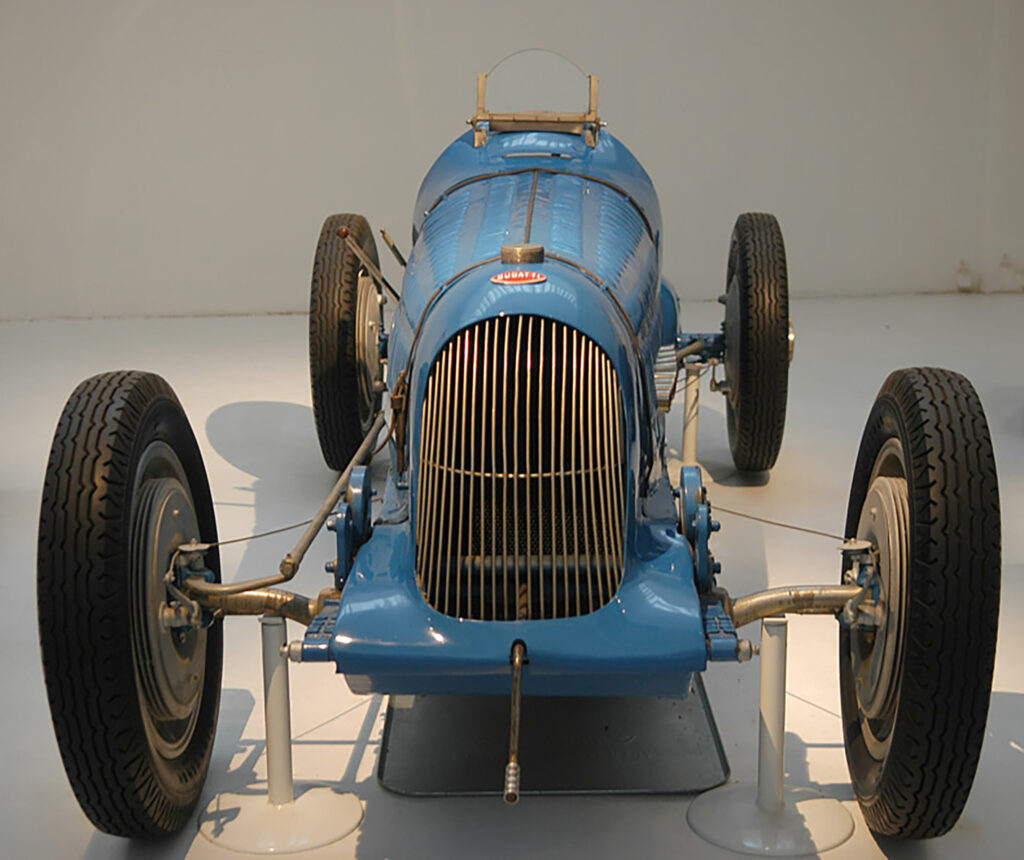 The original Type 51 emerged in 1931. Its engine was a 160 hp (119 kW) twin overhead cam evolution of the supercharged 2.3 L (2262 cc/138 in³) single overhead cam straight-8 found in the Type 35B. A victory in the 1931 French Grand Prix was a rare case of success for the line. About 40 examples of the Type 51 and 51A were produced. The Type 51 is visually very similar to the Type 35. The obvious external differences of a Type 51 are: the supercharger blow-off outlet is lower the bonnet in the louvered section; one piece cast wheels instead of bolted on rims; twin fuel caps behind the driver and finally the magneto being off-set to the left on the dash. However many Type 35 cars have been fitted with later wheels, so that is not a reliable signal.