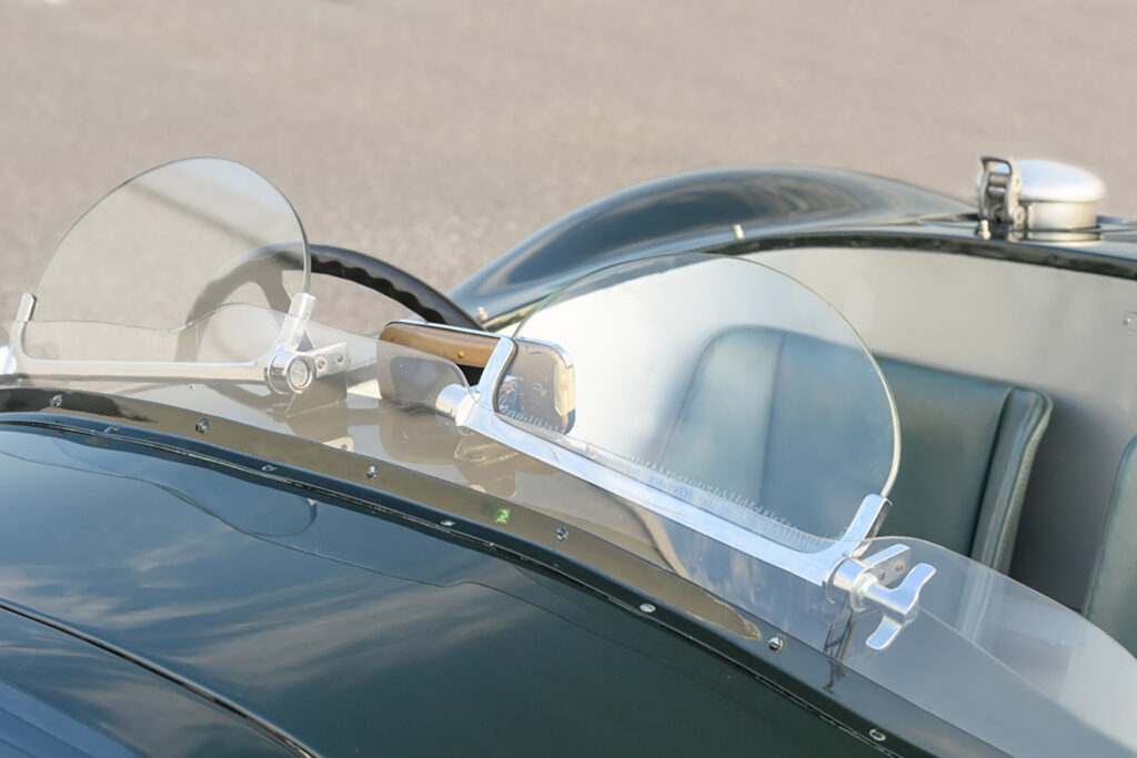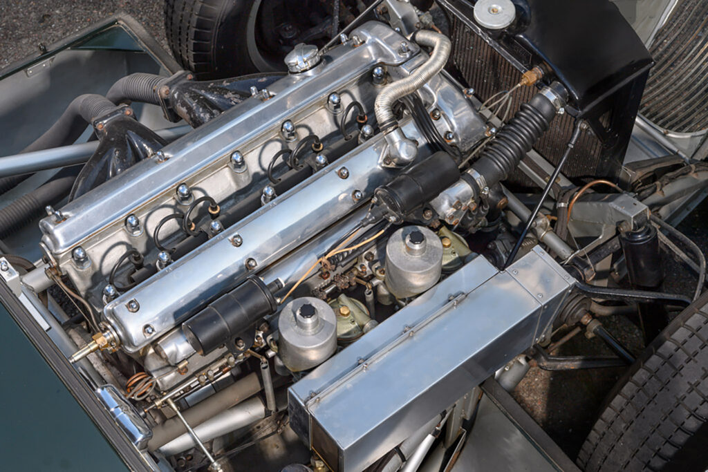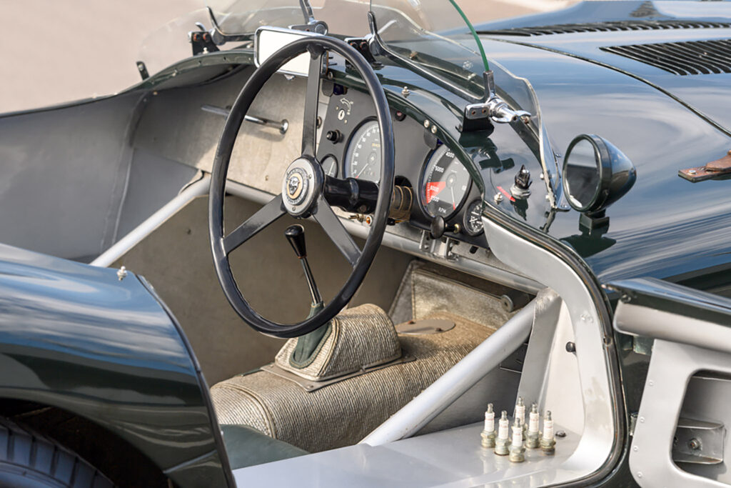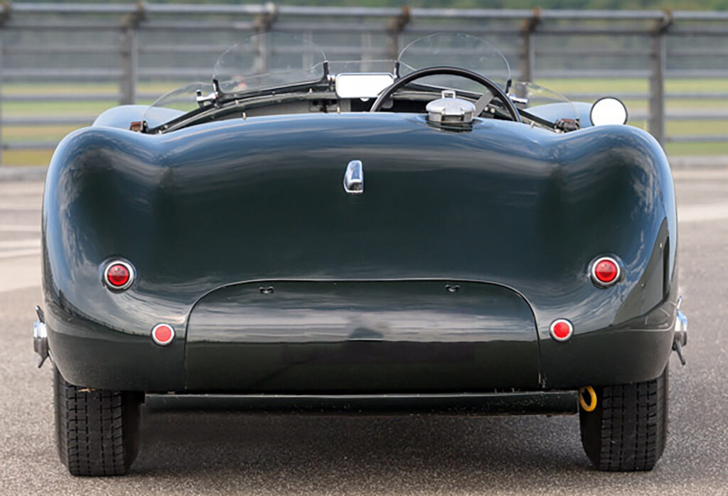 The C-Type replaced the XK120’s steel ladder-type frame with a new tubular design engineered by Bob Knight from 16-gauge tubing with drilled channel-section members and triangulated support. Covering this new chassis was a curvaceous aluminum body designed by aerodynamicist Malcom Sayer. He left a minimum of clearances to give a small frontal area. The body could also be opened up as both the front and rear sections were one-piece.