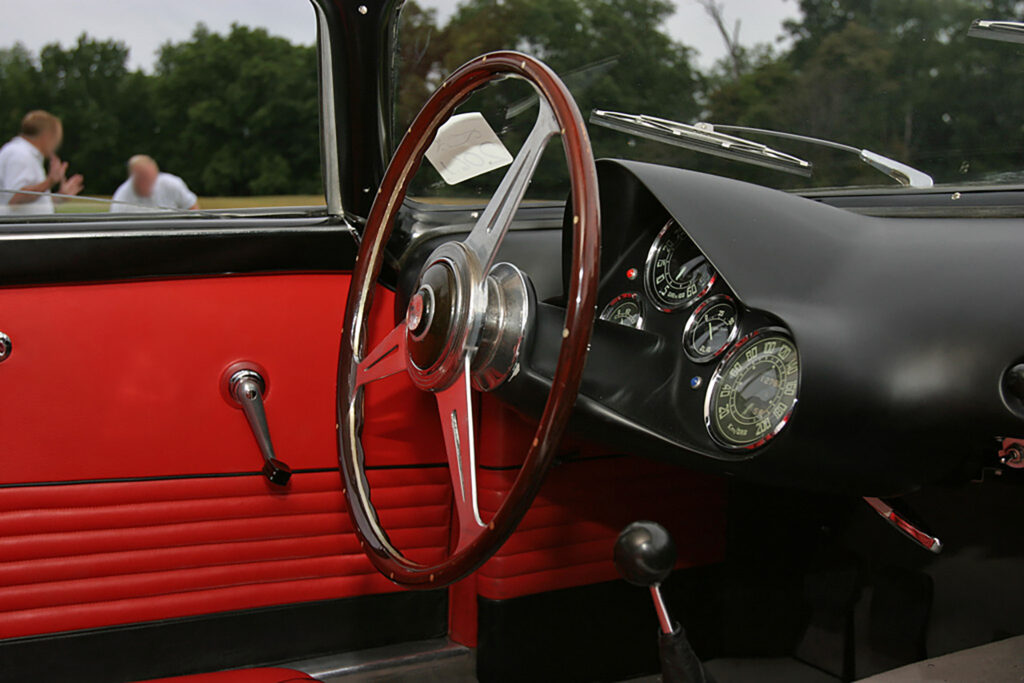 The design of the model was based on a study of aerodynamics. The shape of the front in fact aims to eliminate the problem of airflow disruption at high speeds. The design also aims to do away with any extra resistance generated by the wheels turning, as well as achieving a structure which would create the fewest possible air vortexes. In practice these rigorous criteria would allow the car to reach 200 km/h with the 100 Hp engine mounted as standard. The design that Bertone came up with was for an extremely light car (1100 kg), the ultimate in streamlining, with side windows at a 45 degree angle respect to the body of the car and a large windscreen which blends in perfectly with the almost flat roof. The most surprising part of the car has to be the tail, with the length-ways rear windscreen divided by a slim pillar, and the two fins tapering upwards and slightly inwards, for a highly aesthetic finish. There was no shortage of positive feedback: the car was an immediate hit for its aerodynamics and noteworthy stability at high speeds. Bertone had solved the problem of aerodynamic stability, creating a car with an excellent index of penetration.