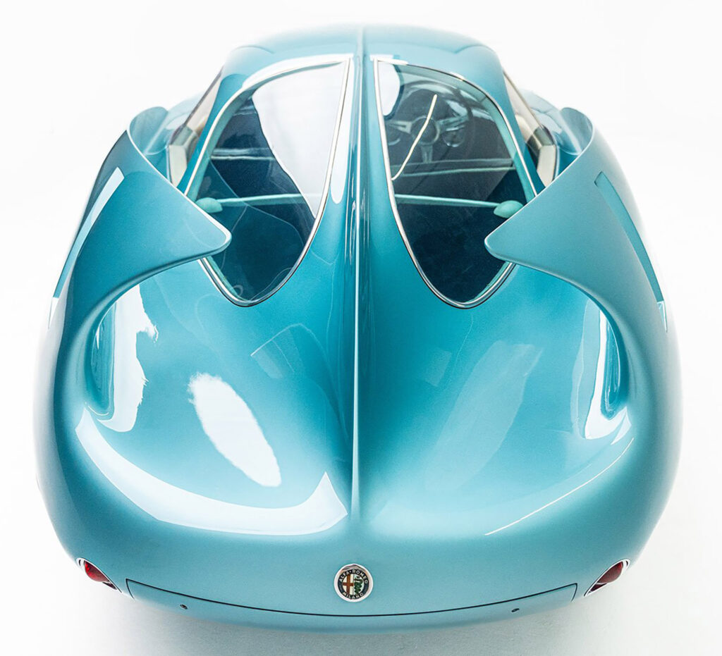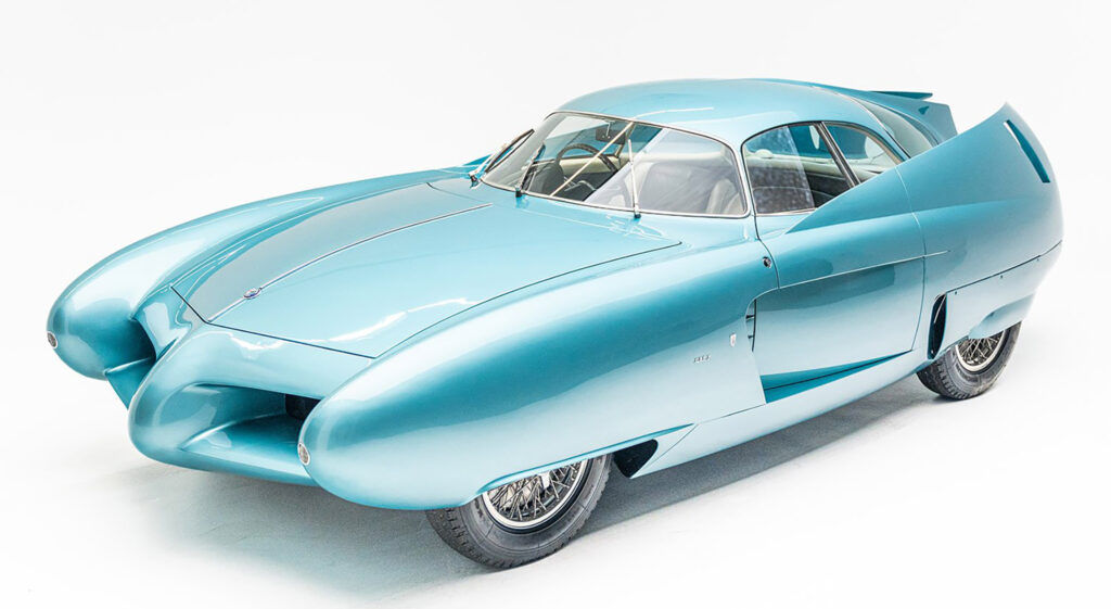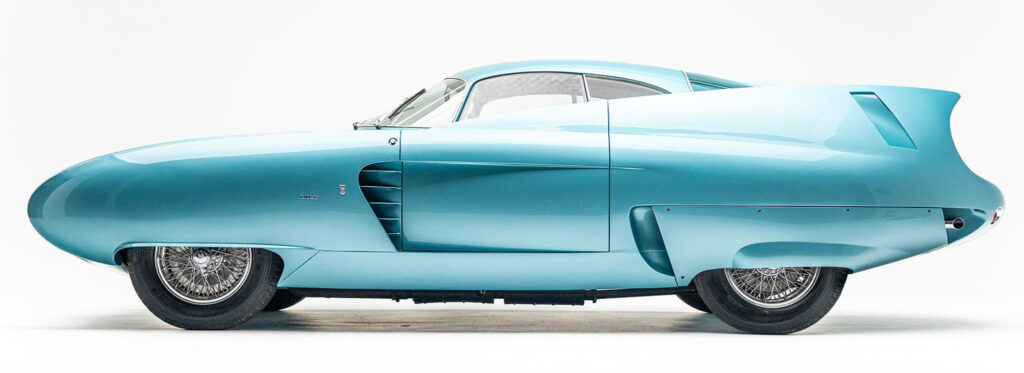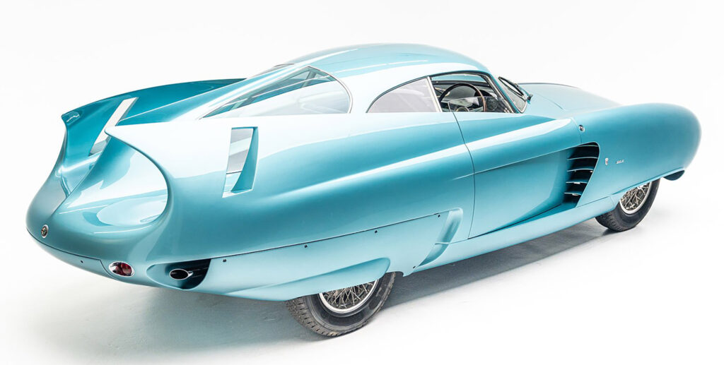 The Berlinetta Aerodinamica Tecnica 7, or B.A.T. 7, took up the styling dictates of the previous model, the B.A.T. 5, and worked them to the limit. once again the car was based on the general idea of the 1952 Abarth 1400 coupE, with Alfa 1900 Sprint mechanics. For this 1954 design, as for the other B.A.T. models, though less evidently, Bertone added some elements from his experience working on wing profiles in the aeronautical industry. The result was the exaggerated shape of the large, curved tail fins.