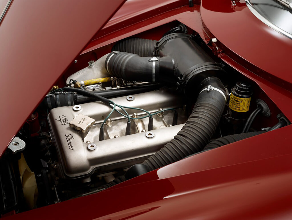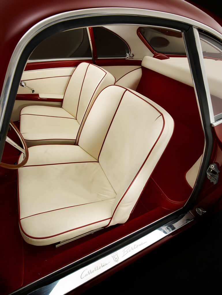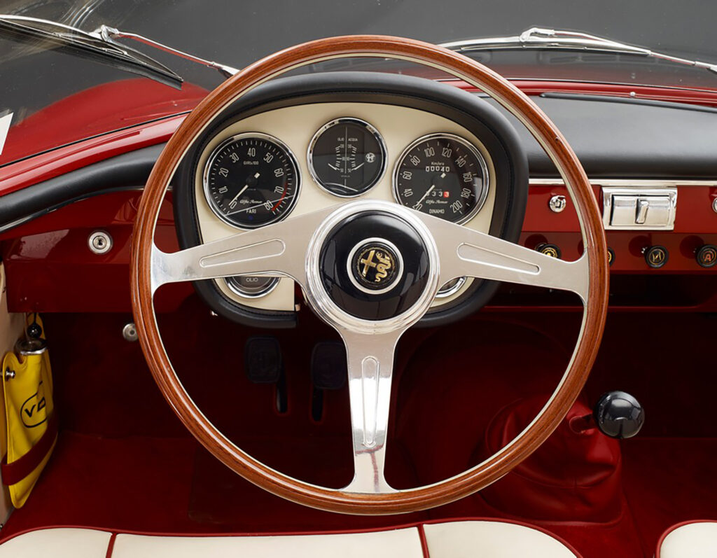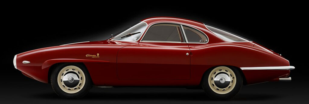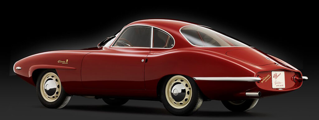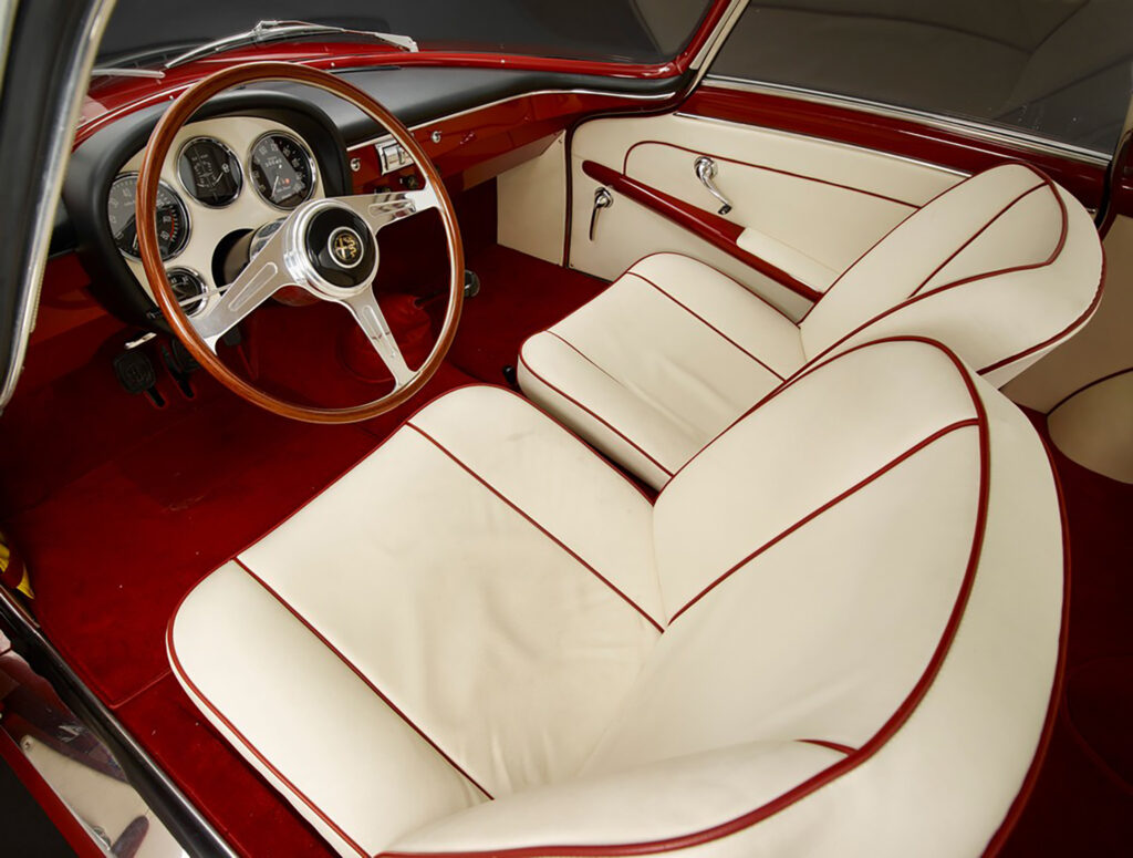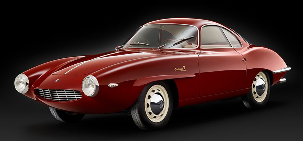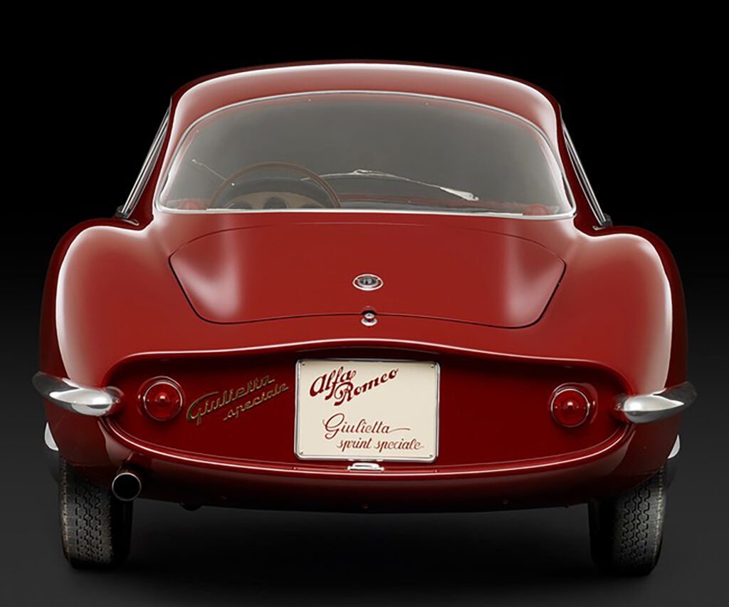 The Sprint Speciale proto-type shown at the Salone di Torino in October of 1957 did not have an Alfa Romeo shield in its grille, and no front bumper to interrupt air flow. According to Donald Hughes and Vito Witting DaPrato in Alfa Romeo Veloce- The racing Giuliettas, the SS initials originally stood for for Sprint Sprinta, meaning ‘Spertuned’. By the time the first prototype, this car, number 00001, had arrived in Turin, it was labled as a Giulietta Speciale, not yet a Sprint Speciale. A bertone shield was set to the right of the script on the fender as it would be in production cars, but above the model name instead of below it. Judging from photos of the show it appears the decision to go with Sprint Speciale had already been made as the display stand the car sits on is labled with a ” Alfa Romeo S.S.”
