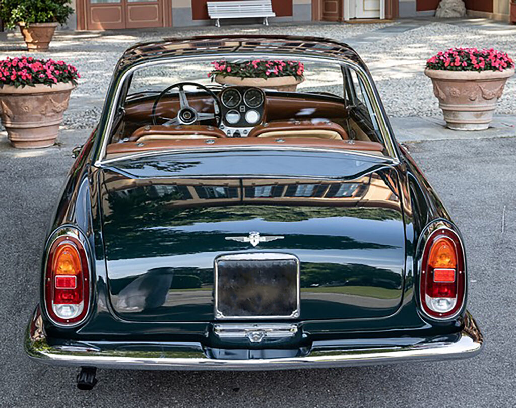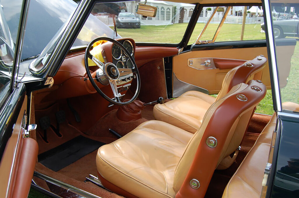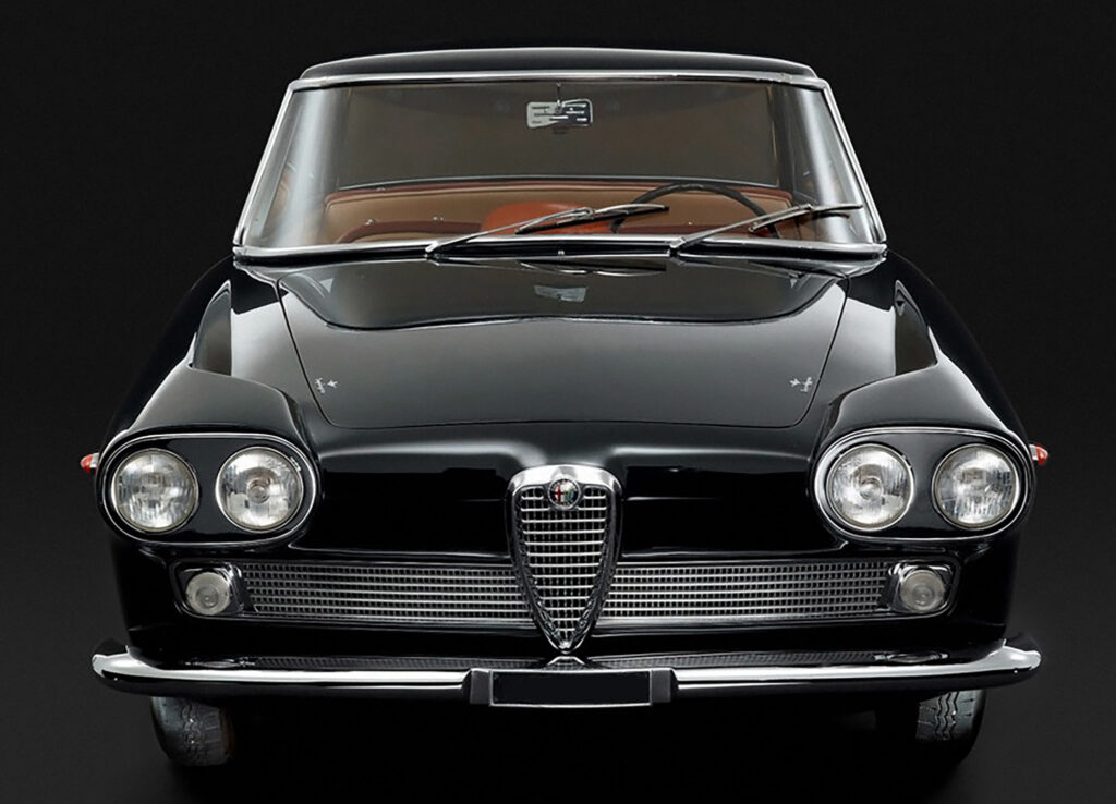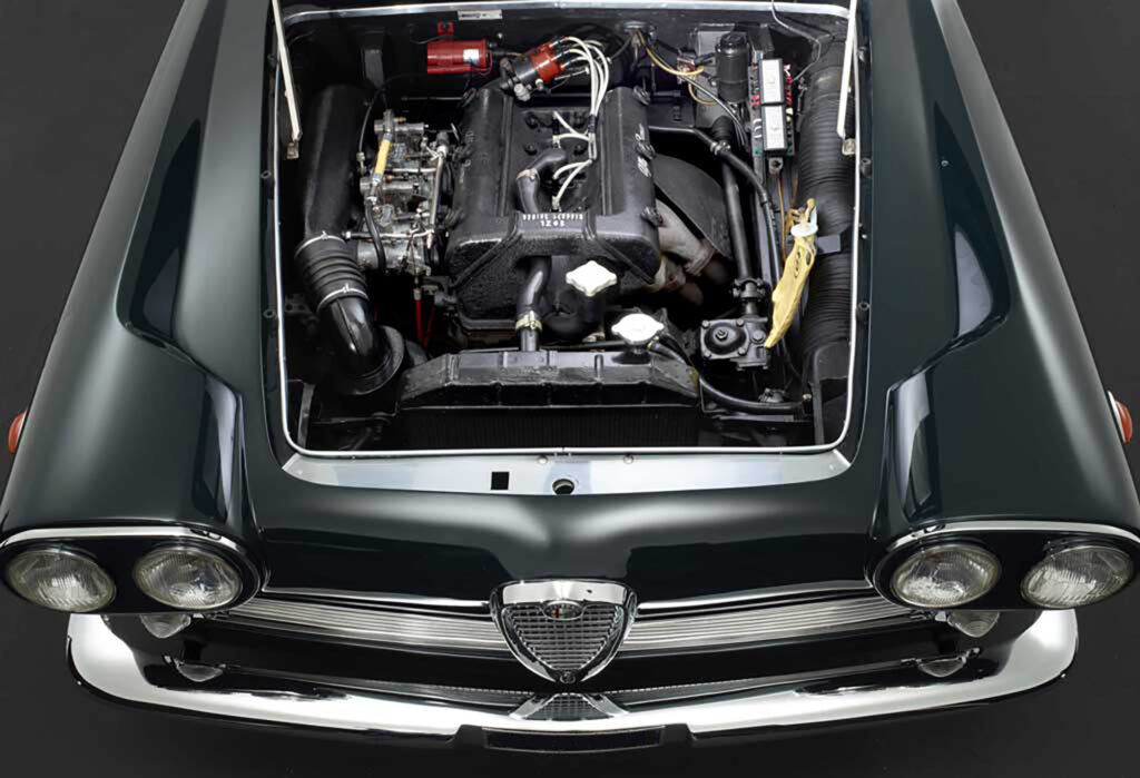 The Praho used the Series 102 platform which was released in 1958 as Alfa Romeo’s larger car. New to the design was integrated twin front headlights which had become mainstream in American design and was a feature on some of the Vignale-bodied 2000s. To retain a slender fender line, a crease was added just behind the headlight surround and this feature is unique to this car.