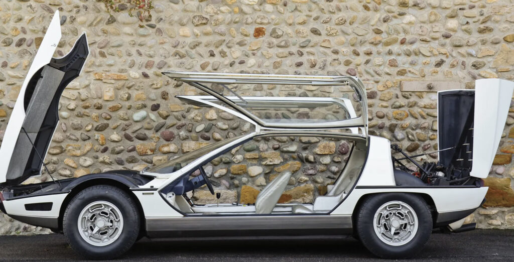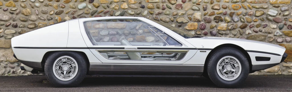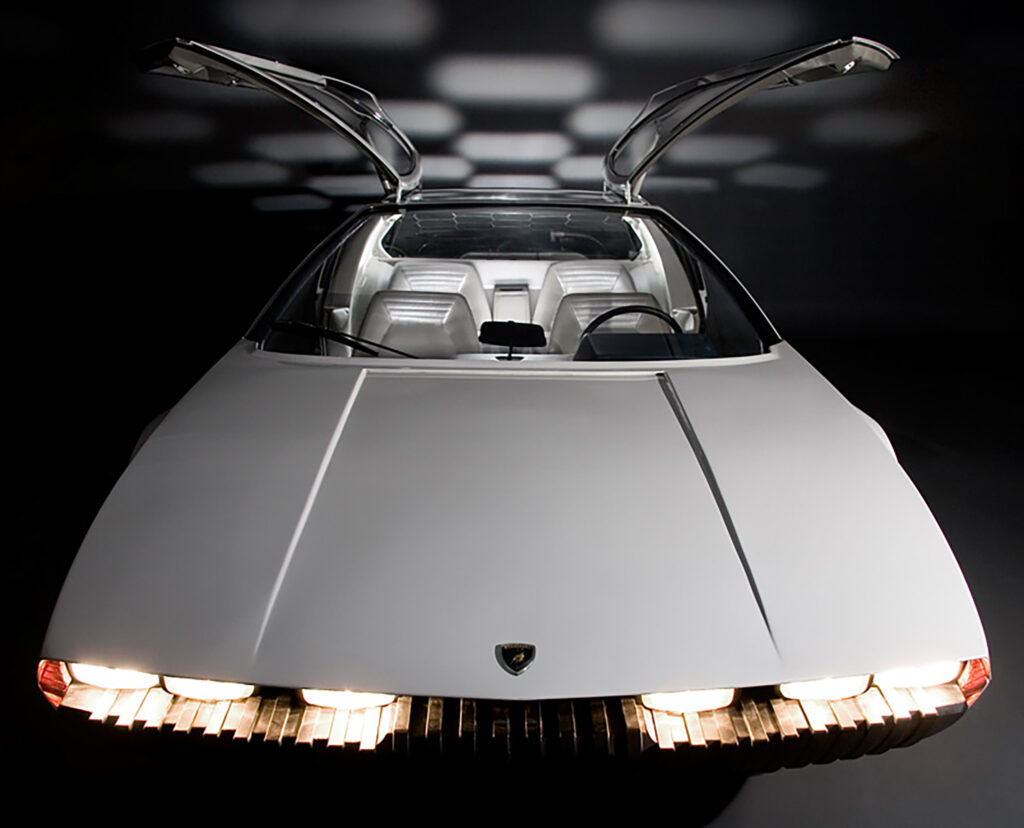 Bertone designer Marcello Gandini was responsible for the P200 Marzal which was first displayed at the 1967 Geneva Motor Show. He gave the car huge gullwing doors with windows below the beltline. Ferruccio Lamborghini said these windows “offer no privacy: a lady’s legs would be there for all to see.” The large use of glass meant that an air conditioner was necessary.