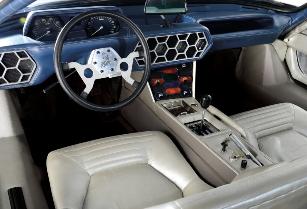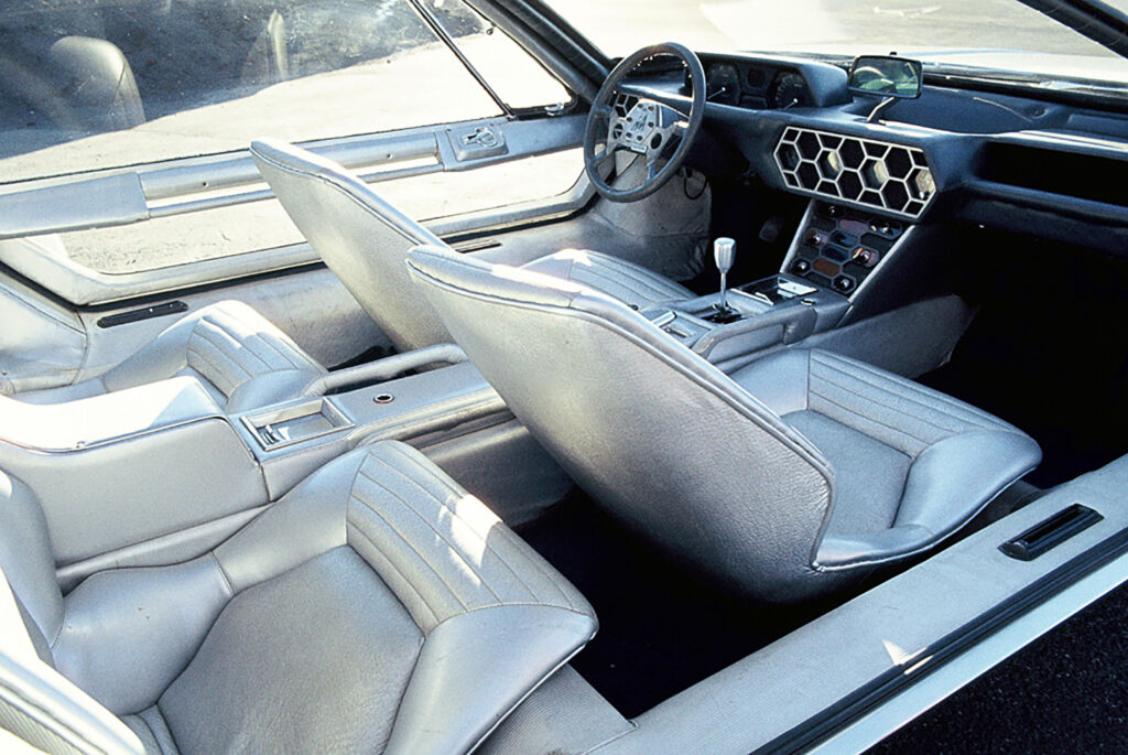 Many prototype patterns were used such as on the top of the rubber bumpers, for rear roof panel and the hexagonal honeycomb pattern in the dashboard, steering wheel and seat cushions. These were later modified. Polished aluminum sills and Campagnolo Magnesium completed the look.