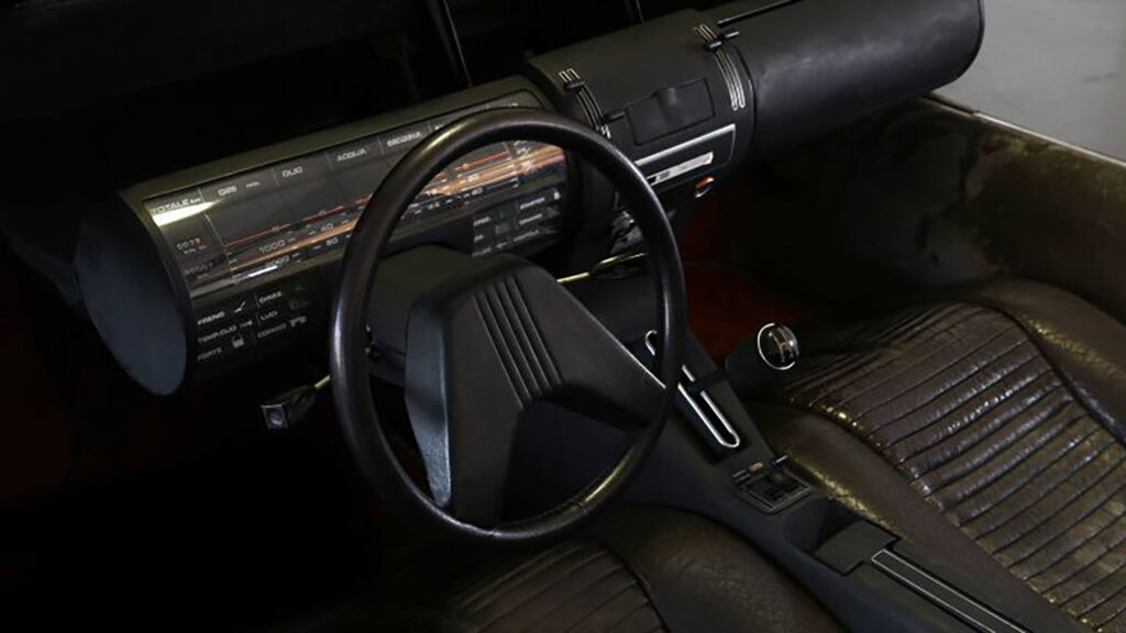 Interiors are dominated by small basin seats and by a cylindrical dashboard: visualizations is permitted by the rotation of two graded cylinders, that, rotating, aim the horizontal reference line. Actually it’s the right opposite of what normally happens, where the scale is fixed and the pointer moves.