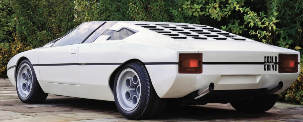 Needing a replacement for the Urraco, Lamborghini had Bertone design the Bravo concept car as a possible replacement. The Bravo was first seen at the 1974 Turin Motor Show and was extensively tested before becoming a permanent feature of the Bertone collection. Powering the rear wheels was a 300 bhp V8 which was tested in the car over 40,000 miles.