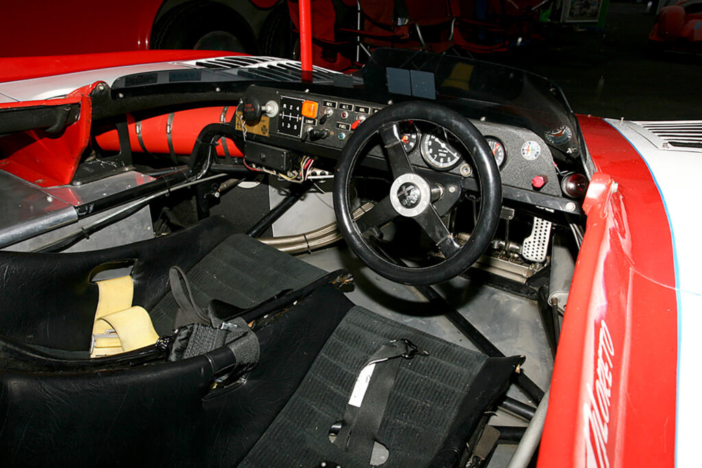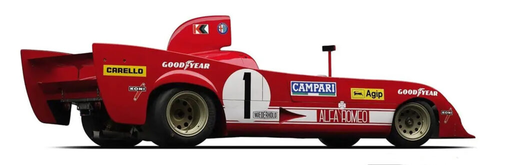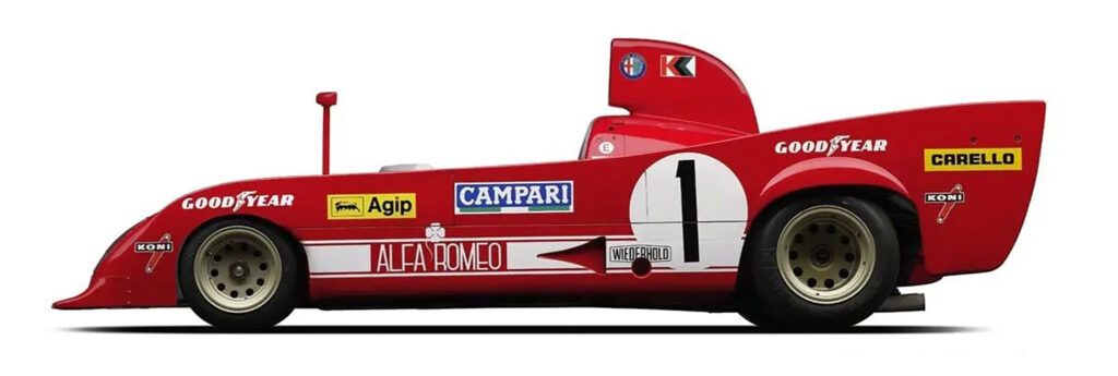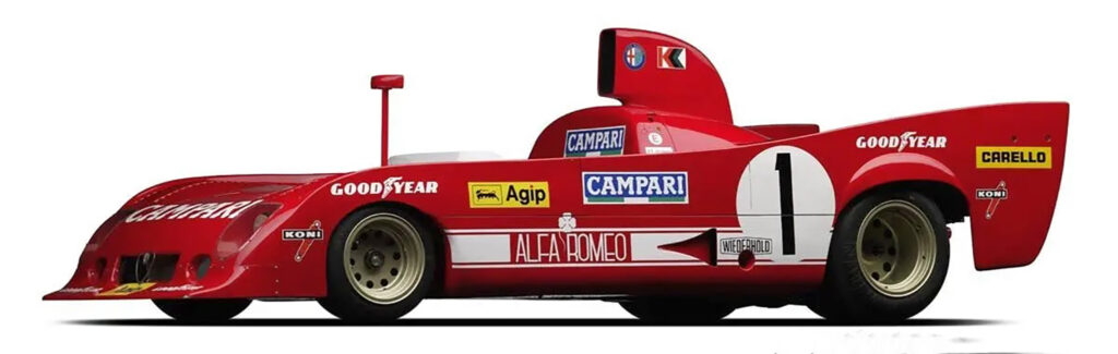 For 1973, Alfa Romeo fielded the all-new Tipo 33TT12. Elegantly clothed in a fibreglass body with a light alloy tubular chassis it was also blessed with a 12 cylinder boxer engine capable of producing 500bhp, despite this the 33TT12 was still in its infancy and was not a match for the likes of Matra and Ferrari. 1974 started well for the Autodelta Alfa Romeo outfit with 33TT12s finishing a formidable 1-2-3 at Monza but the Matras remained the car to beat and again the Championship laurels would elude Alfa Romeo, disconsolately the Autodelta-run factory team decided to retire from Sportscar racing along with Ferrari and Matra. With the obvious competition for the Tipo 33TT12 absent, wealthy German private entrant Willy Kauhsen went to Carlo Chiti with the concept of running the redundant 33TT12s in the 1975 World Manufacturers Championship. A deal was thus structured by which Autodelta would professionally run a variety of top level professional drivers in at least two (sometimes three) 33TT12s as a non factory supported team under the W.K.R.T. (Willibert Kauhsen Racing Team) banner. During the winter of 1974/1975, Autodelta modified the suspension in order to use superior Goodyear tyres, upgraded the brakes and incredibly managed to further lighten the car thus bringing weight down to just 670kgs. Success was almost a pre-requisite and the Alfa Romeos fended off an early challenge from Alpine-Renault and Porsche to dominantly romp home with seven victories from the eight races entered, taking the World Manufactures Championship and the Drivers’ crown en-route.