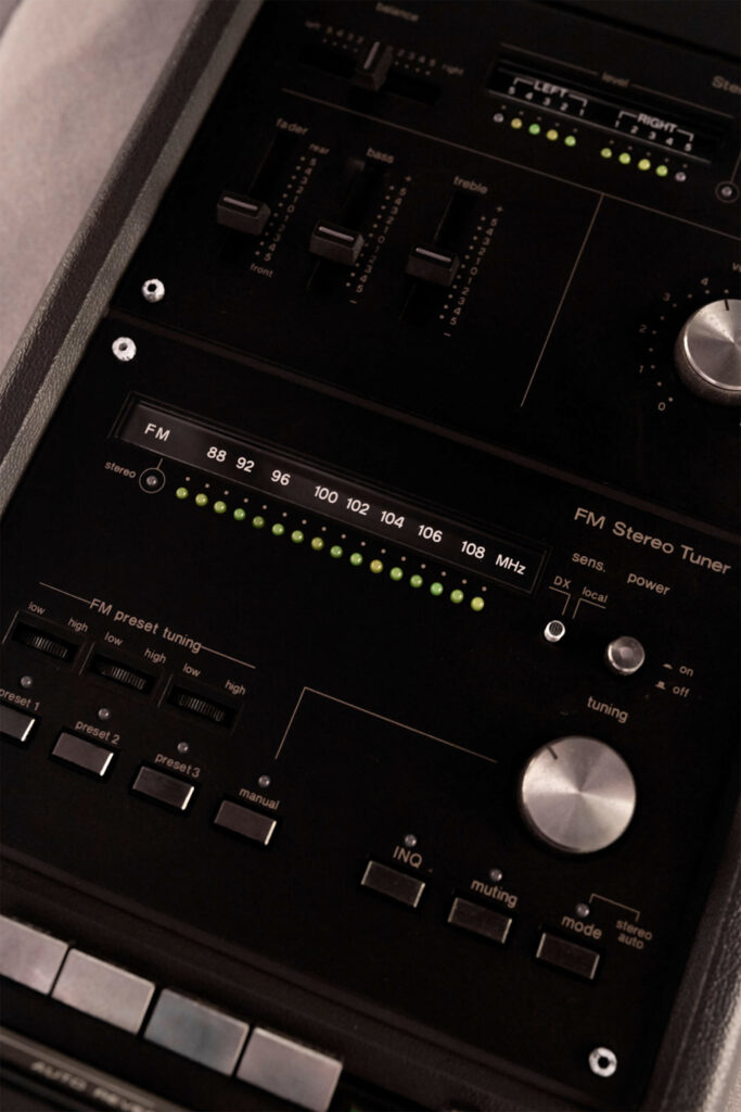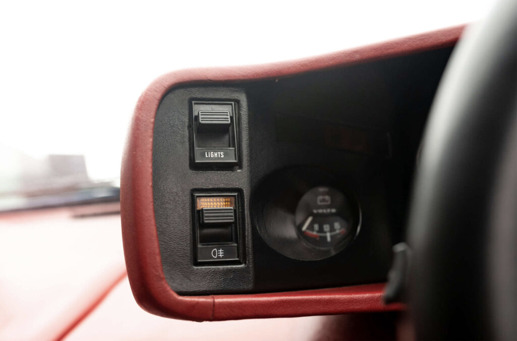 A distinctive rear spoiler which incorporates tail lamp and registration plate housings is used to balance the car and give high speed stability. Giugiaro has retained the Esprit’s basic cockpit configuration though several detailed changes have been make including an instrument panel which now boasts a turbo boost gauge and speedometer running up to 170mph. Air conditioning controls are now situated in a centre console panel and all switchgear is backlit when main and side lights are illuminated. A National Panasonic stereo cassette radio unit is a standard feature of the Esprit Turbo and built into the roof of the car – two speakers being in the bulkhead behind the driver and passenger and two in the facia below the windscreen pillars. The seats have revised foam foundations and new head restraints while the standard interior trim is “fine tone” ruche stitched leather.