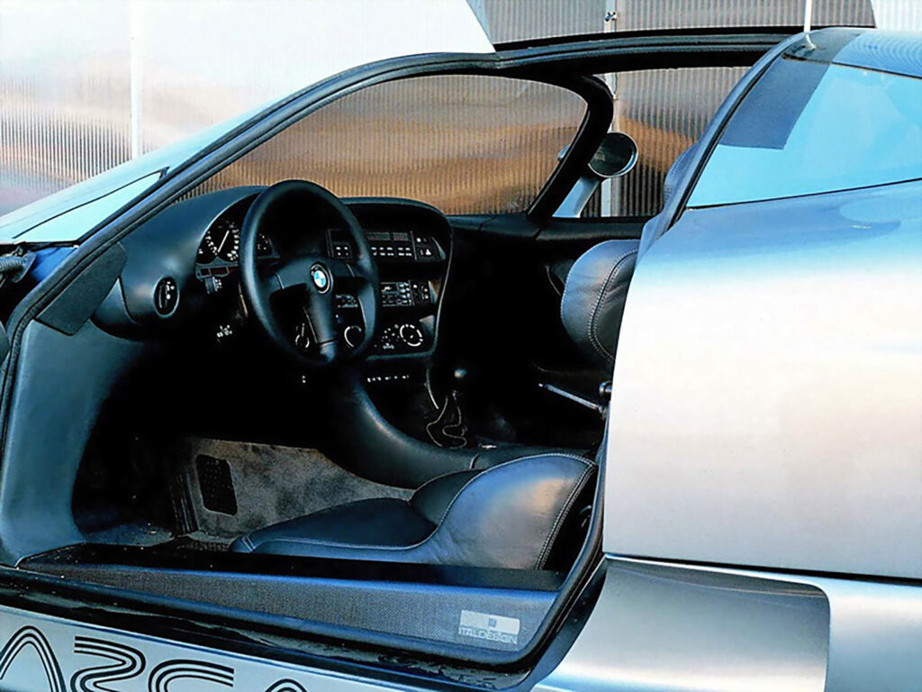 Giugiaro had already styled BMW’s first modern supercar, the 1978 M1, so his newer M12 was a natural evolution. Both cars shared the same BMW ‘kidney’ grill, low profile and mid-engine layout. Unlike the angular-lines from the seventies, Giugiaro gave the M12 a completely round greenhouse. Unfortunately, this also meant that split doors had to be fitted because the compound curve of the glass was too steep. Thus, the glass section of the door hinged at the T-Bar while the rest regular door swung out normally. Italdesign also fitted the entire greenhouse with mirror-finish tint, making it impossible to see the occupants or interior inside.
