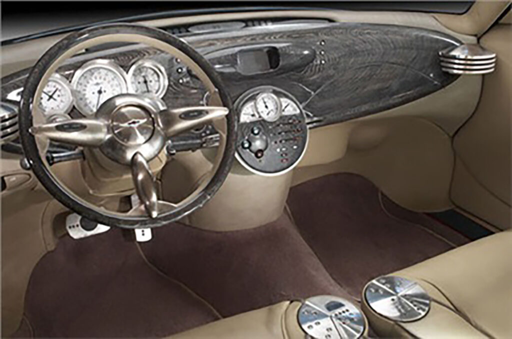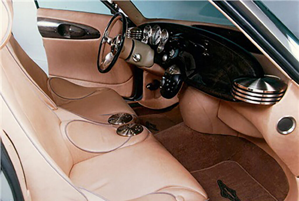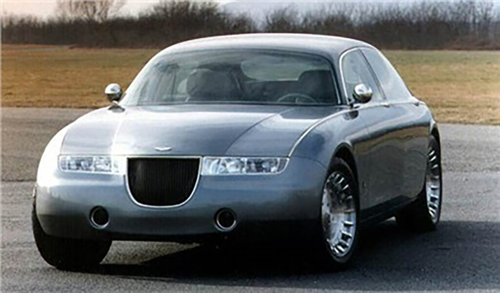 The Aston Martin Lagonda Vignale is a five-seater concept car built by Ghia for Lagonda. It was designed by Moray Callum at Ghia and unveiled in 1993 at the Geneva Motor Show alongside the Aston Martin DB7, designed by Moray’s older brother, Ian Callum. Built to gauge interest for a 4-door Aston Martin model, the concept was well received, but never went into production as Ford decided that the Lagonda brand would be too expensive to revive due to its relative obscurity outside of the U.K. Interior Design by David Wilkie: Colour and materials by Sally Ericson. The Lagonda Vignale is based on an extended 1990 Lincoln Town Car chassis and uses that car’s 4.6 L Ford Modular V8 engine producing 190 hp (142 kW; 193 PS) and 270 lb⋅ft (366 N⋅m) of torque and mated to a 4-speed automatic transmission. It also shares the Town Car’s independent front, and solid rear suspension. It was planned that a production version of the Lagonda Vignale would utilise a 5,935 cc (5.9 L; 362.2 cu in), 48 valve V12 engine. The body of the Lagonda Vignale is made from composite materials and features nickel trim in place of chrome to take advantage of the subtle tones found in nickel. The interior was designed by David Wilkie and its materials were chosen by Sally Wilson. It features analine-dyed parchment leather, beech wood and aluminum trim, woolen carpets and headliner, nickel brightwork and rear power operated desks which feature a laptop on one side and a vanity on the other. Three Lagonda Vignales were built in total. The original two, built by Ghia, had seating for five and used the Town Car 4.6 L V8 engine. One was finished in grey while the other was finished in Sorrento Blue. The grey car was destroyed, while the blue car was sold in 2002 by Ford for US$403,500 at auction, surpassing its estimate of US$60,000–120,000. The third car, built by the Works Service department and codenamed DP2138, featured a myriad of changes from the original design with the intention of putting the car into production. It used a different Ford platform, giving it smaller dimensions, changes to the design, including different headlights and a redesigned grille, burgundy paintwork, and, most notably, a Jaguar V12 engine. Additionally, it could only seat four as the rear bench seat had been replaced by twin armchairs. Only one example was built and it was sold to the Sultan of Brunei for £1.3m in 1995.