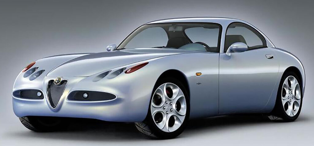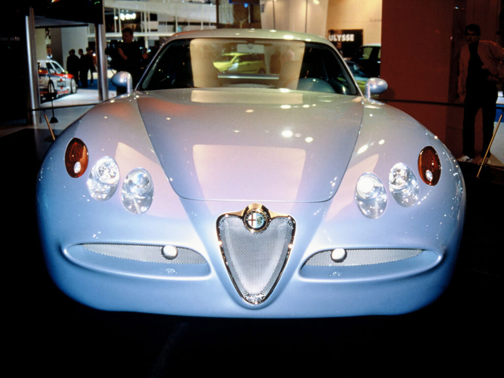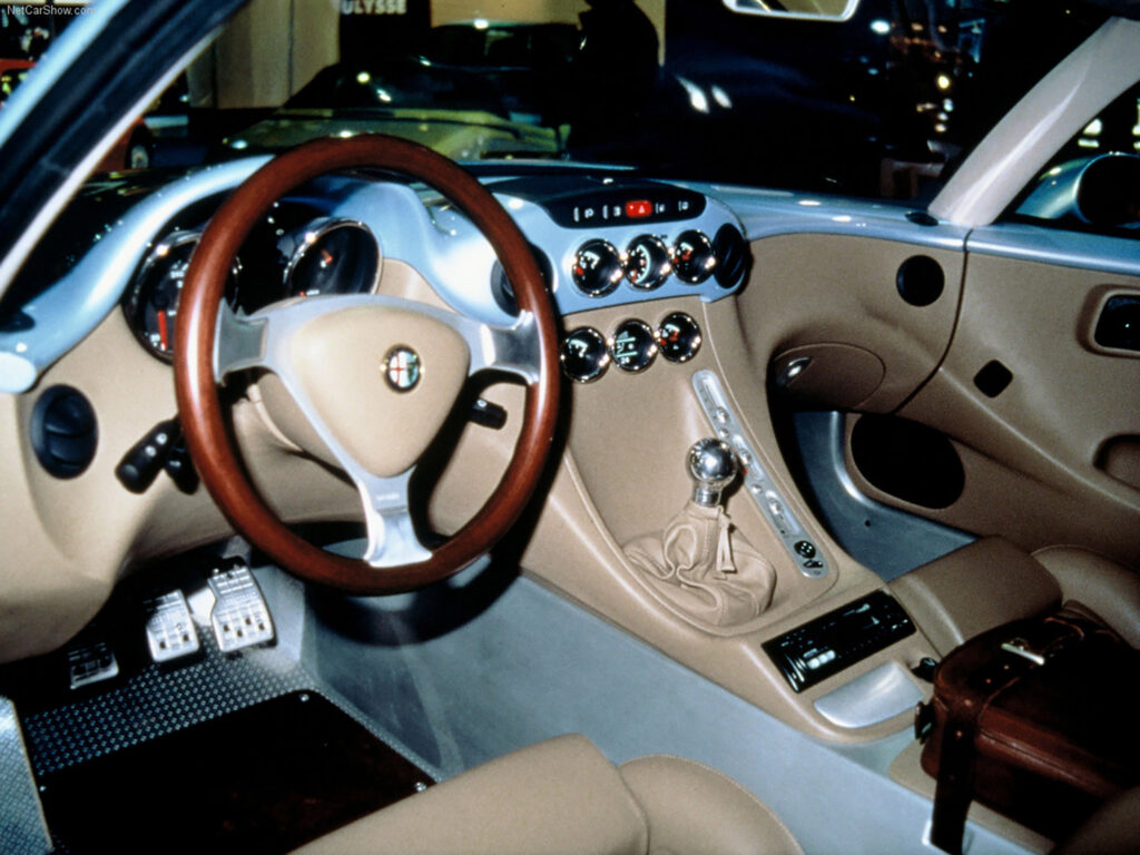 The cutting edge coupé that came to be known as Nuvola was launched at the Paris Motorshow in 1996. Designed by the Alfa Styling Centre, the sleek two seater show car made several references to Alfa Romeos of the past (from the 8C 2900 to the 6C 2500 Villa d’Este, the Giulietta Sprint Speciale and the 1900 Sprint). Futuristic luminous diode technology was used for the slim, horizontal rear lights and the tyres had a special pattern created for Alfa Romeo by Michelin. With this proposal, Alfa Romeo returned to a separate frame to which the mechanical components were attached. A welded high strength steel tubing spaceframe brings the benefits of lightness, high torsional rigidity, excellent ride quality and maximum passenger protection as well as low cost of manufacture.