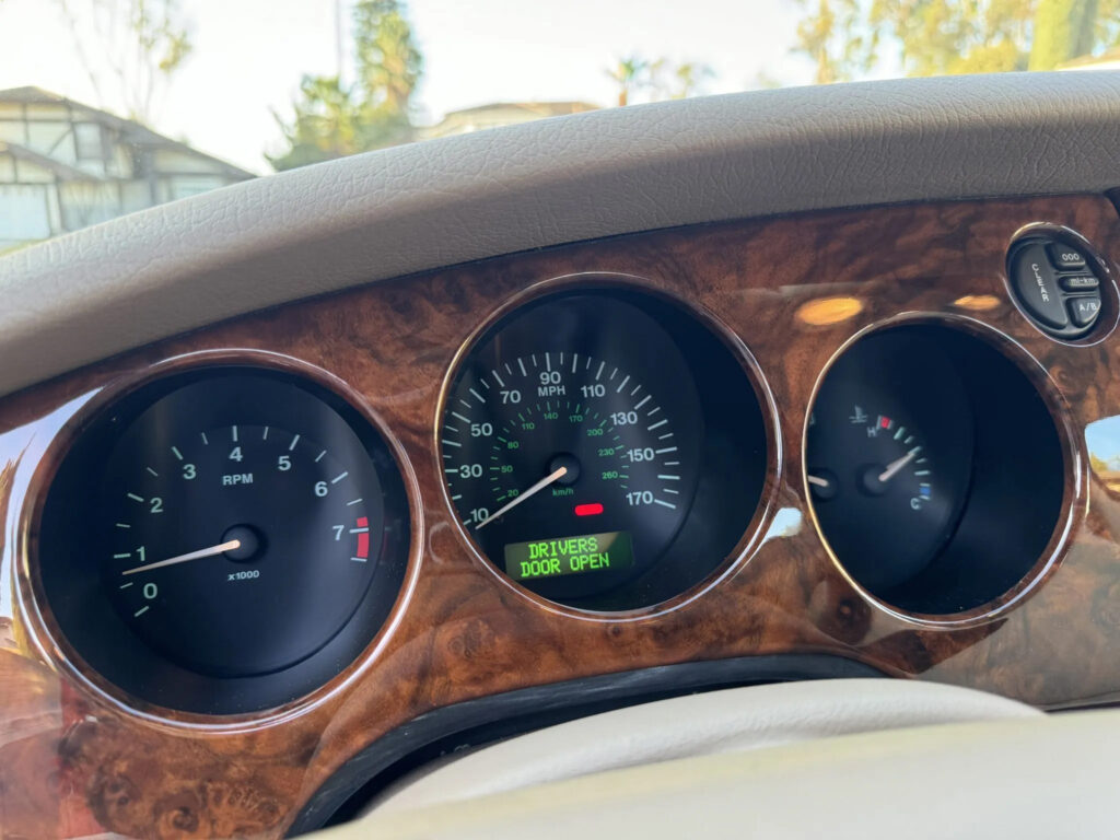 Both the XK8 and XKR are electronically limited to a maximum speed of 250.1 km/h (155.4 mph). The XK8 came standard with 17-inch alloy wheels, while 18-inch (Standard on the XKR), 19-inch, and 20-inch wheels were available for additional cost. The XKR models used Pirelli P Zero tyres measuring 245/45ZR-18 at the front and 255/ 45ZR-18 at the rear. Jaguar’s Adaptive Cruise Control, introduced in late 1999, is an optional feature available on both models. Both the two-door coupé and two-door convertible came with an all-leather interior, burl walnut trim, and side airbags. The interior was available in two trims, classic and sport. The sport interior trim was aimed for younger buyers and featured an interior designed by Karen Anderson which involved leather upholstery with cloth seats. The classic trim was a more luxurious option and featured heavy use of leather. Jeremy Clarkson, during a Top Gear test-drive, likened the interior of the original XK8 to sitting inside Blenheim Palace. Although reviewers have criticised the high seating position and the improper gauge layout of the interior.