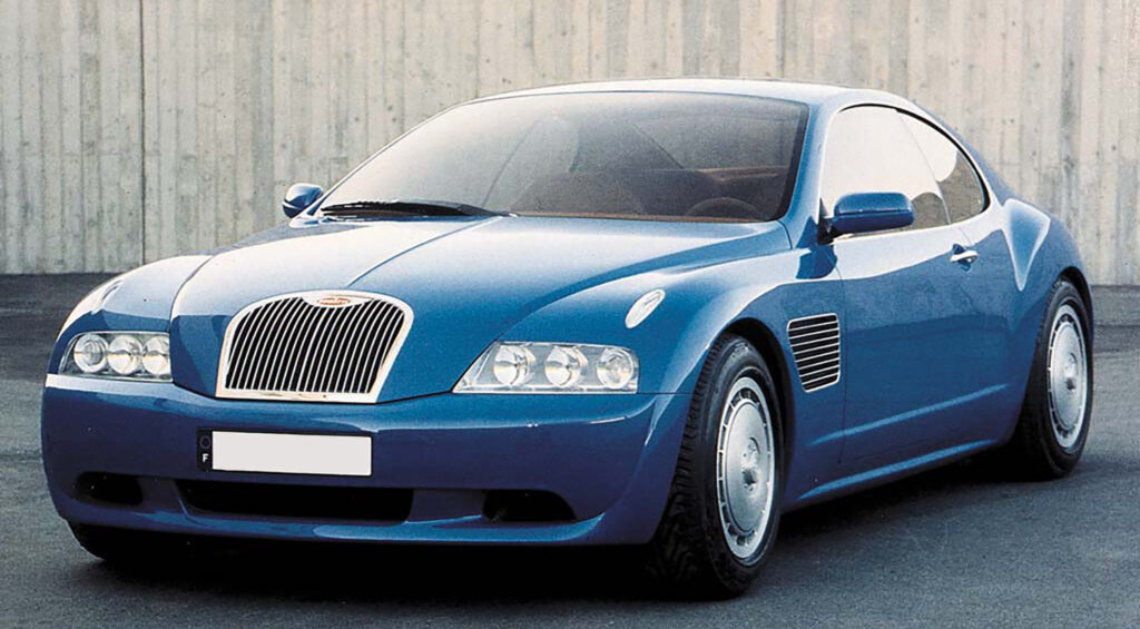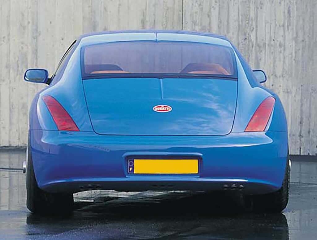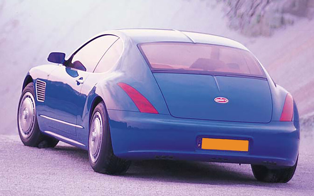 Giorgetto Giugiaro was responsible for the design which he later called his greatest car. With this design he brought back the classic Bugatti shoehorn grill and a sloping rear end reminiscent of the Type 64 with its center crease line.