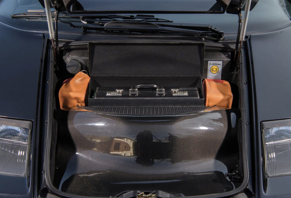 Particularly distinct was the front bodywork which accommodated a wider track, brake cooling ducts and a front-mounted oil cooler. Air entered the oil cooler from the very front of the car and exited via an extractor atop the bonnet. A large engine scoop also sat atop the engine cover feeding the V12 with fresh air. Unlike the SV, airflow for this scoop was dynamically controlled by the on-board computer.