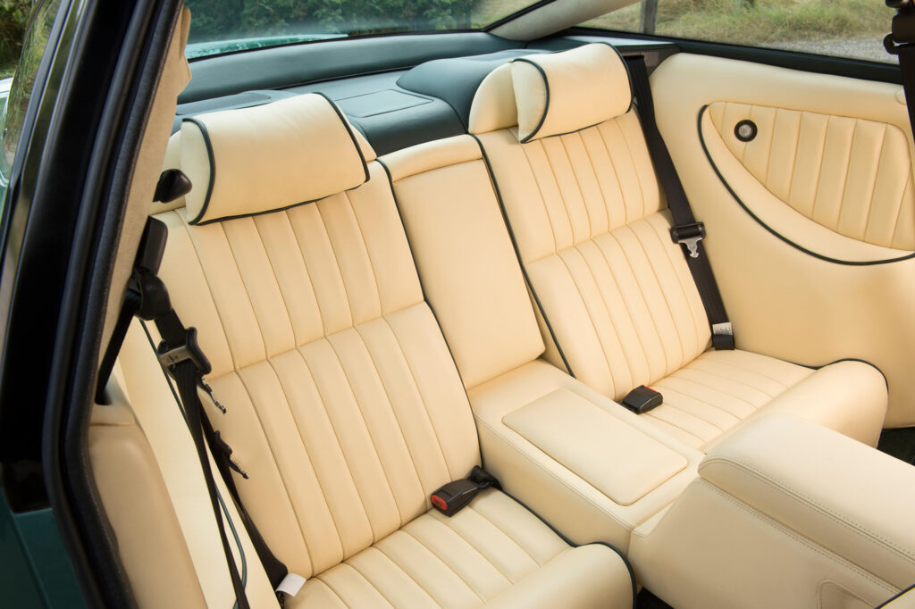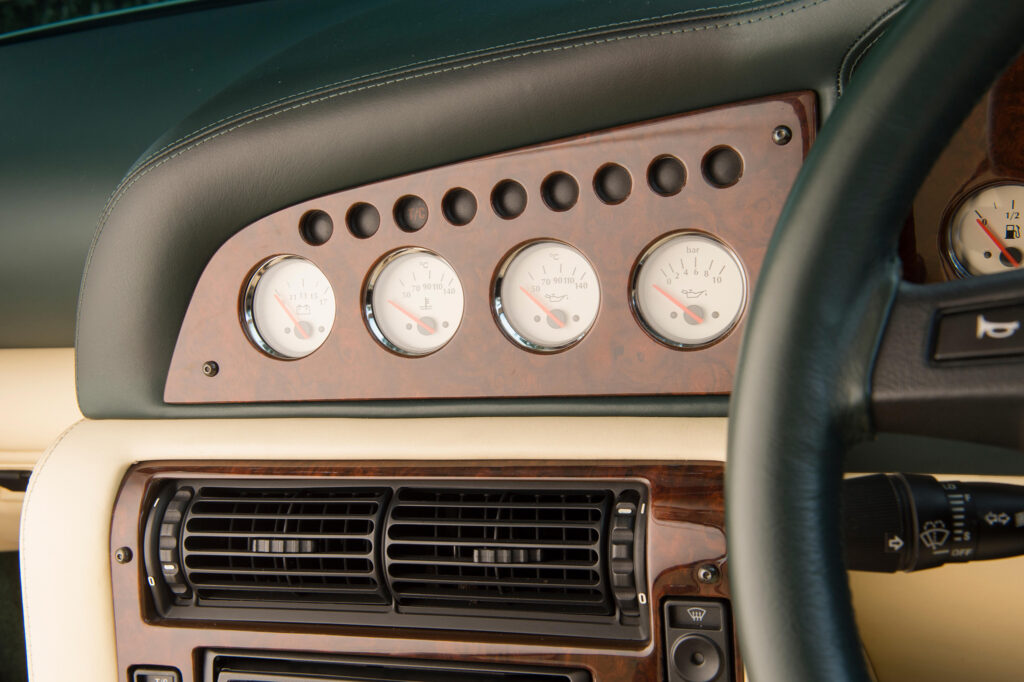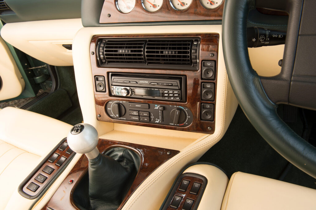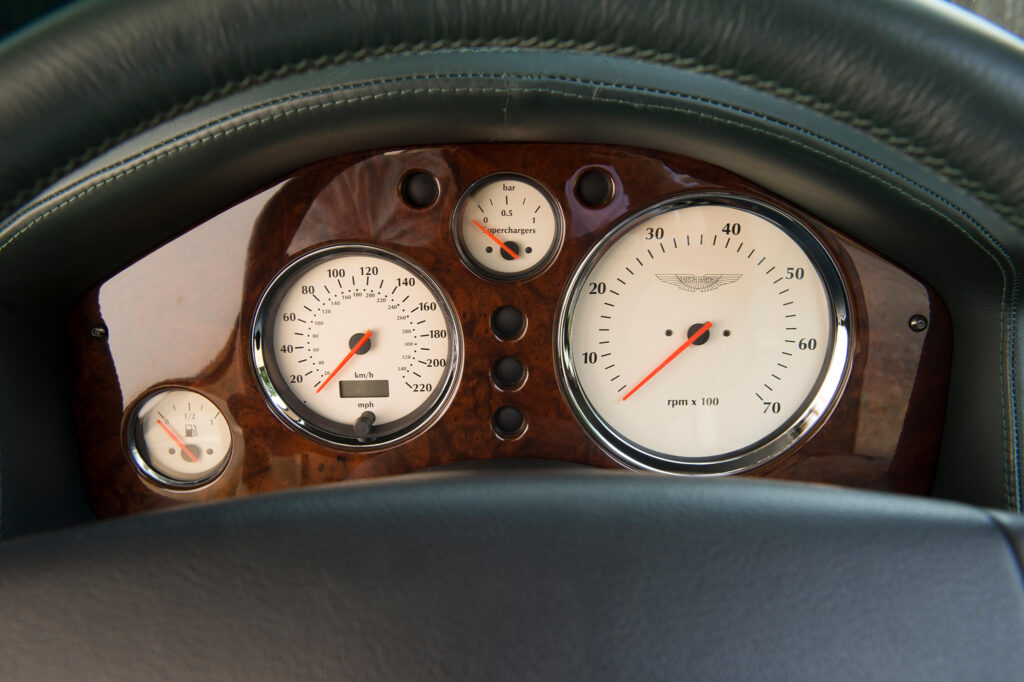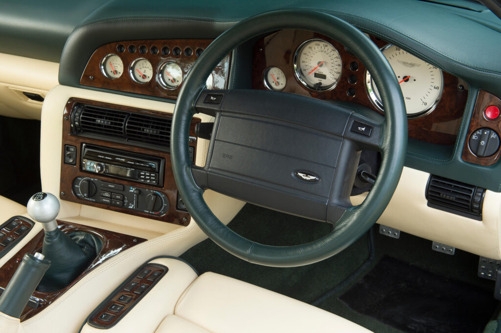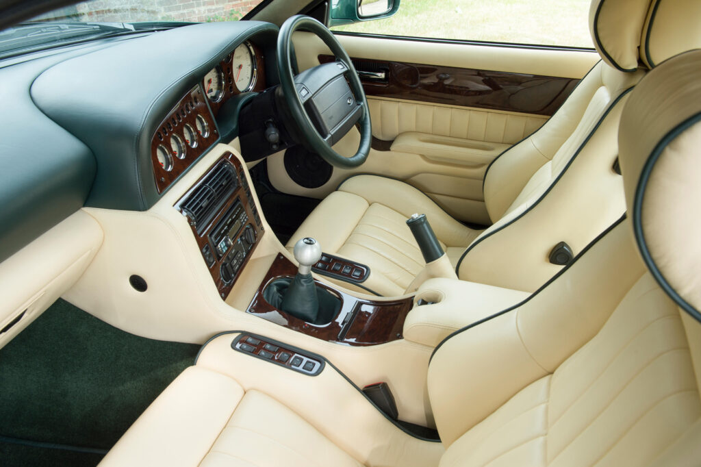 The interior of the LeMans reflects the competition heritage of the company and is a development of the scheme previewed with the Project Vantage concept car during 1998. It has drilled bright metal brake, clutch and accelerator pedals and a machined aluminium knob fitted to the gear lever. The traditional wood veneers which are used for the instrument panel, centre console and door trim panels were replaced by Titanium finish panels together with a magnolia-faced instrument display which is dominated by the enlarged tachometer and the engine start button. Other amenities included Wilton carpets and Connolly leather upholstery.