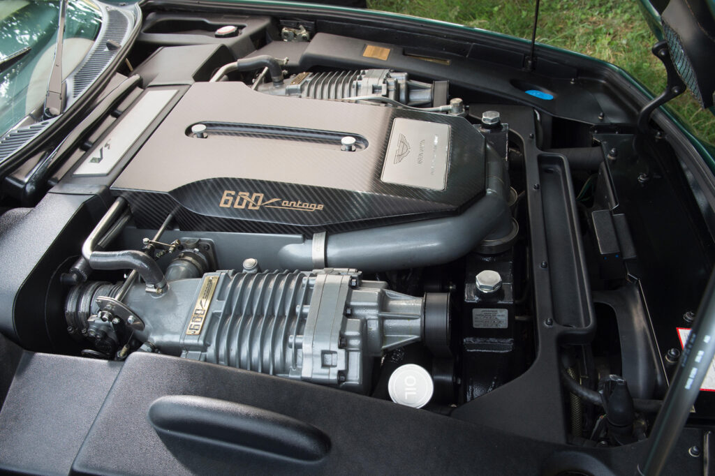 Available with a choice of either a 550 or 600 horsepower twin supercharged 5.3 litre Aston Martin V8 engine had almost three times the power output of the six cylinder Le Mans winning DBR1. With the optional V600 engine upgrade it uses 2 Roots-type Eaton M90 superchargers to produced 600 bhp and 600 ft lbs of torque. This means the Le Mans Vantage has the potential to exceed 200mph and reach 100mph in less than 10 seconds.
