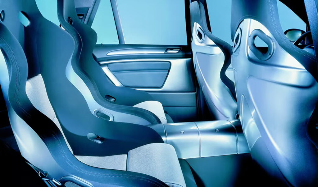 Exterior dimensions are basically the same as on the standard X5. The interior, on the other hand, looks quite different, with a definite high-tech touch. The more comfortable standard seats were replaced by four bucket seats with a particular emphasis on sportiness, and aluminium stands out as a predominating element throughout.