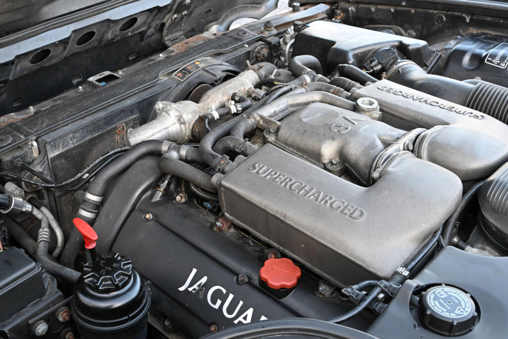 The XJR is powered by the supercharged version of the 4.0 L V8. It is also equipped with sport suspension, wider wheels and tyres, and matte-black exterior window trim, except in the United States market, where the XJR was given chrome window frames and rain gutters. Like the Sport model, the XJR has a body-coloured radiator grille surround; it is with a stainless-steel mesh insert rather than the normal vanes. Other exterior touches include the XJR rear badging and larger exhaust outlets.