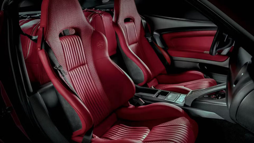 The front elements have been repositioned as they were on the most important Alfa racing cars of the past – the whiskers and shield are aligned at the same height – a decision of historical and evolutionary significance. But a rapid glance will reveal that the styling of the whole exterior is full of classical references, an ideal opportunity for a modern interpretation of traditional Alfa stylistic cues. For example, the front end recalls the former 33 Coupe Stradale, while the rear sports the characteristic round light clusters of the Giulia TZ.