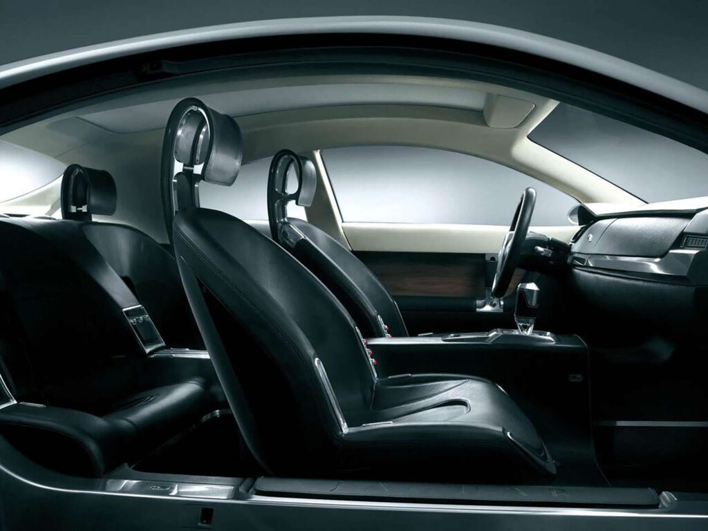 A broad, solid aluminium ‘switch beam’, topped by an aniline leather-trimmed lower instrument panel, runs across the facia. It is broken in the centre by a cover for the navigation and ‘infotainment’ display screen, revealed when the cover swivels backwards into the instrument panel. The touch-sensitive screen, developed by Alpine Electronics, features unique ‘Shutter LCD’ technology that allows passengers to watch a moving image = for example, a DVD – while the driver sees only the essential driving functions: navigation, climate-control etc.