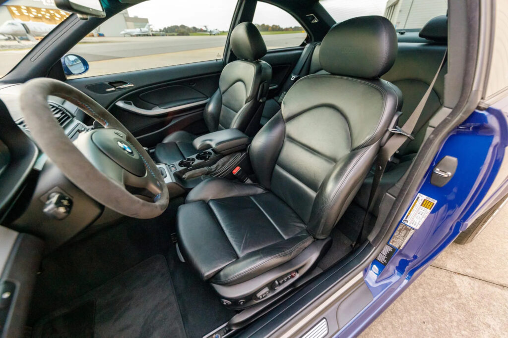The interior enhancements of the package are subtle but purposeful. The Alcantara steering wheel and handbrake grip feel good to the touch. The addition of the steering wheel-mounted button for the DSC M track mode requires the deletion of the multi-function controls and cruise control. The Competition Package is available with all M3 Coupe interior and exterior color combinations. Two trim items are exclusive to the Competition Package. Special Competition Package aluminum trim is included on the interior. A new exterior color, Interlagos Blue, is offered only with this package.