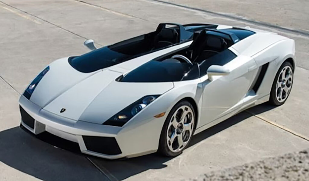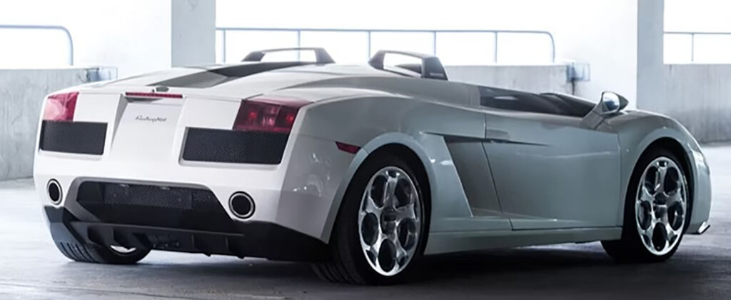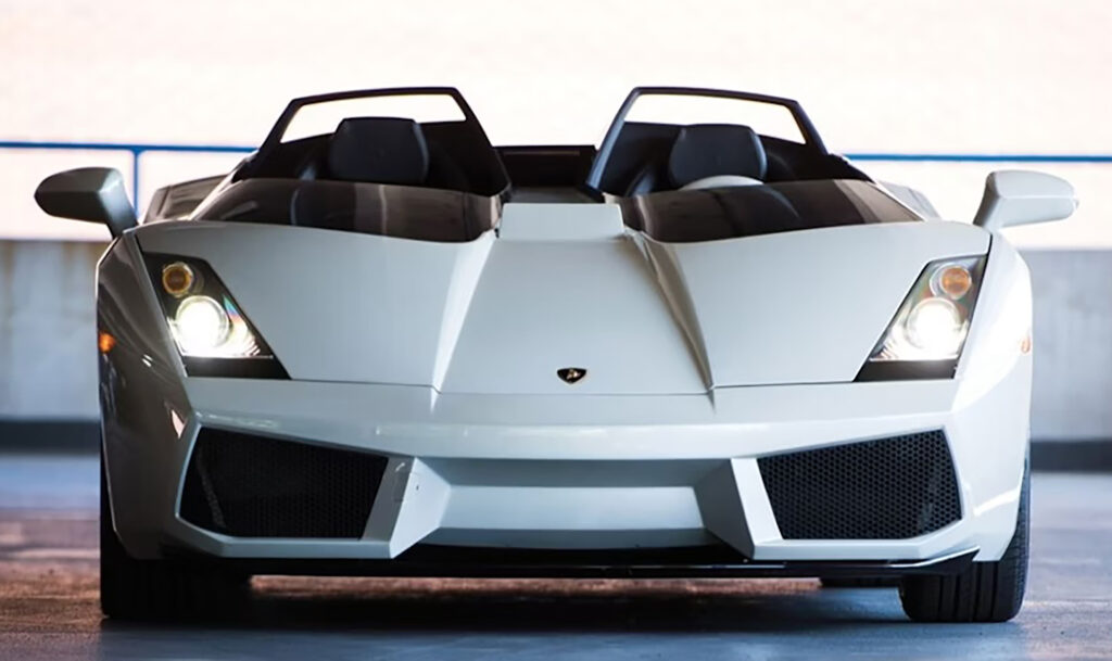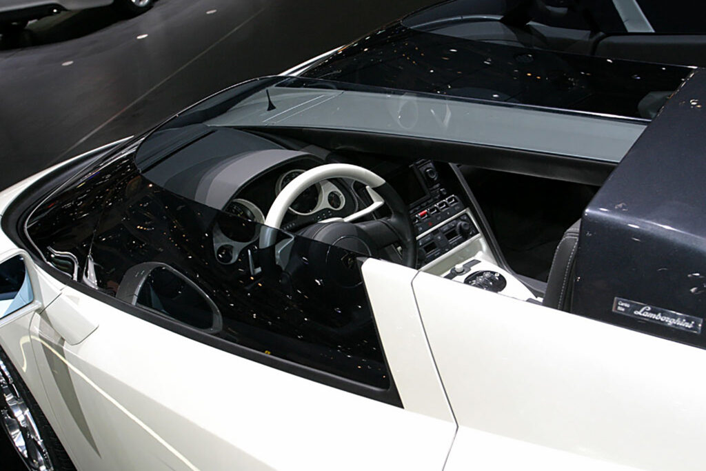 Luc’s idea was to modify a Gallardo, Lamborghini’s ‘baby supercar’, into a roadster which would be reminiscent of classic single-seater racing cars. Using the Gallardo as a basis, the car does not have its traditional windscreen, but instead twin wrap around units, like the Plexiglas units from the fifties.