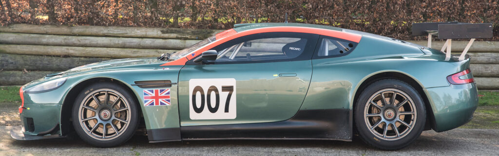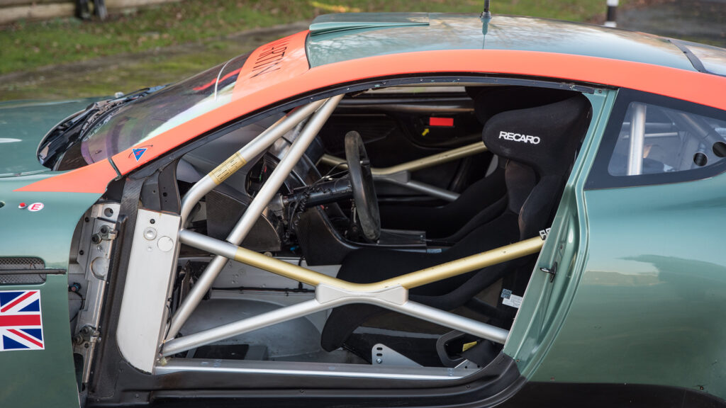 The DBRS9 is based on the DB9 road car, but shares many design features from the full GT1 specification DBR9. It uses the road car’s aluminium bonded chassis with a DBR9-based roll cage. Aston Martin Racing’s engineers have tuned the standard 12 cylinder, six litre engine to produce approximately 550bhp (an increase of 20%) and reduced the overall weight by 480kg, to increase the power to weight ratio to nearly 430 bhp/tonne. Much of this is down to the extensive use of carbon composite materials for all the body panels (except the roof) and on the interior trim, as well as polycarbonate side and rear windows.