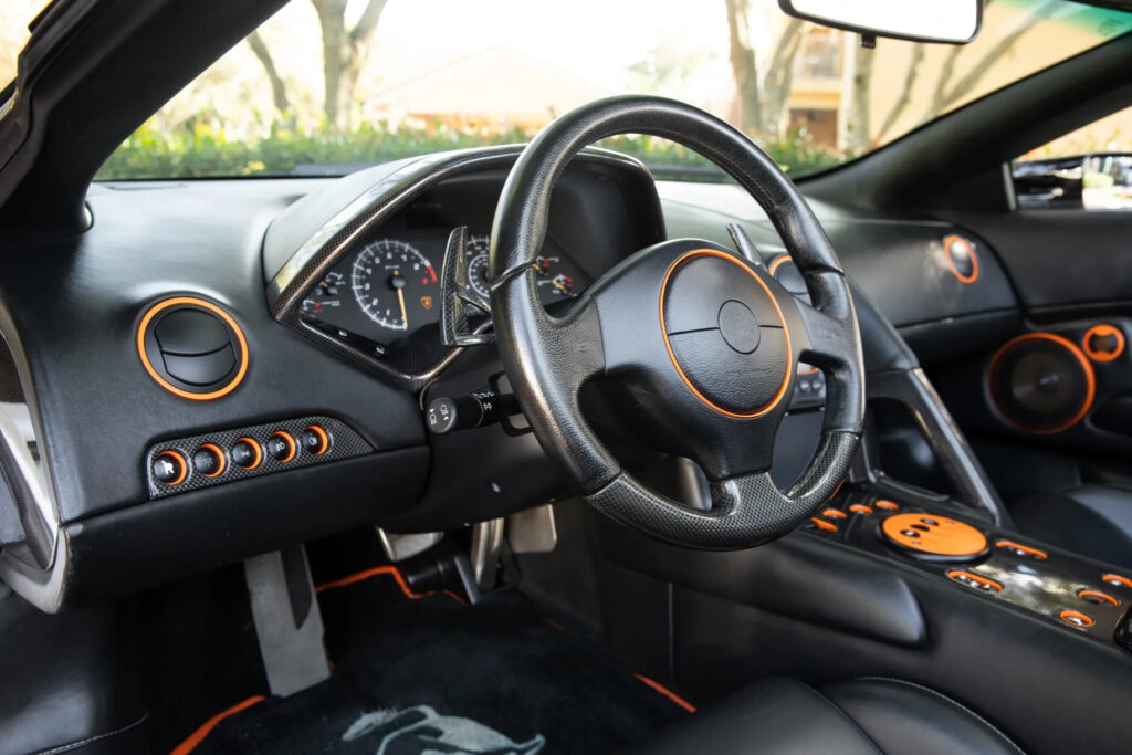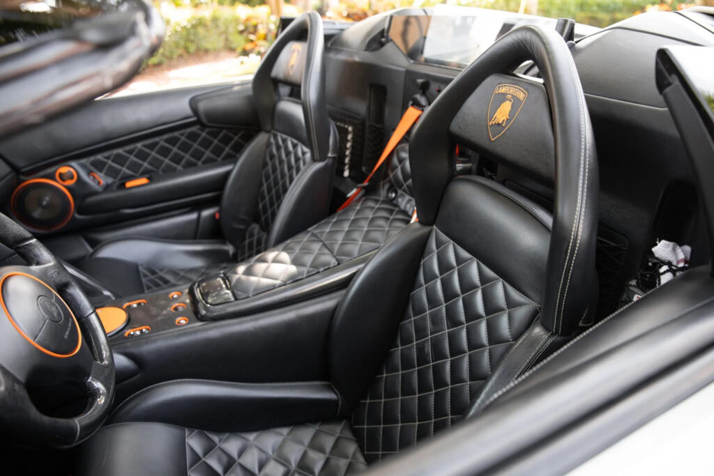 From its forerunner, the Lamborghini Murcielago Roadster LP640 has inherited the characteristic asymmetrical interior arrangement. The whole interior is tailored to the driver and arranged in such a way that a true driver-focused experience is offered; a car which challenges yet at the same time is entirely geared to the driver. This is illustrated in the use of perforated leather for the chair cushions, the dashboard tunnel console and the door lining on the drivers side.