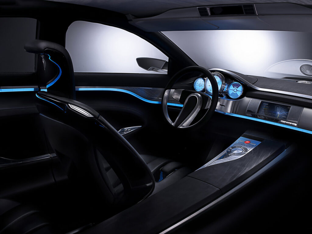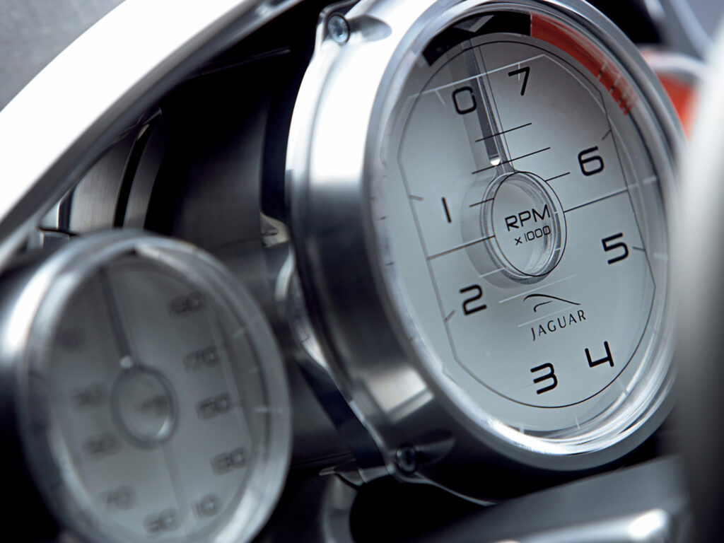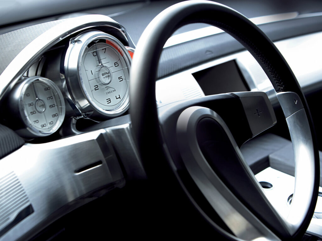 Between the seats runs a tall central transmission tunnel that gives the occupants a sense of sitting deep within a futuristic cockpit. One of the keys to any Jaguar interior is that occupants should feel as if they are enclosed in the car, not sitting on it. The C-XF’s interior cossets in just such a way, creating an inviting cabin for passengers to slip into, rather than surrounding them with bland, open space.