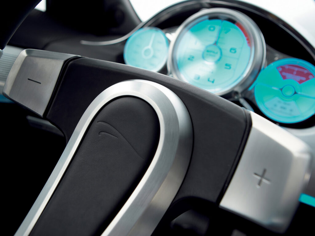 Also contained within the rotating panel are air vents that, like the screen, are hidden from view until the driver requires them. This is in complete harmony with the overall sophistication of the driver environment. Behind the single-spoke steering wheel with âfloatingâ gear-selector paddles sits a dial cluster that has been inspired by the cockpit of an airplane. The main central dial â the rev counter â has graphics reminiscent of an artificial horizon instrument from an aircraft. The dials also respond to the way C-XF is being driven. If the driver puts the transmission into sporting Dynamic mode, the rev counter motors outwards (in the way a long lens on an SLR camera operates), ensuring its increased prominence.