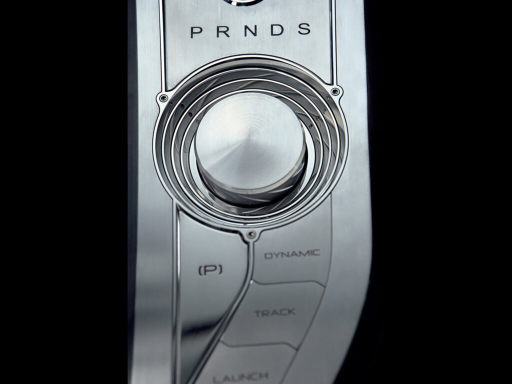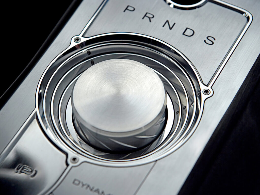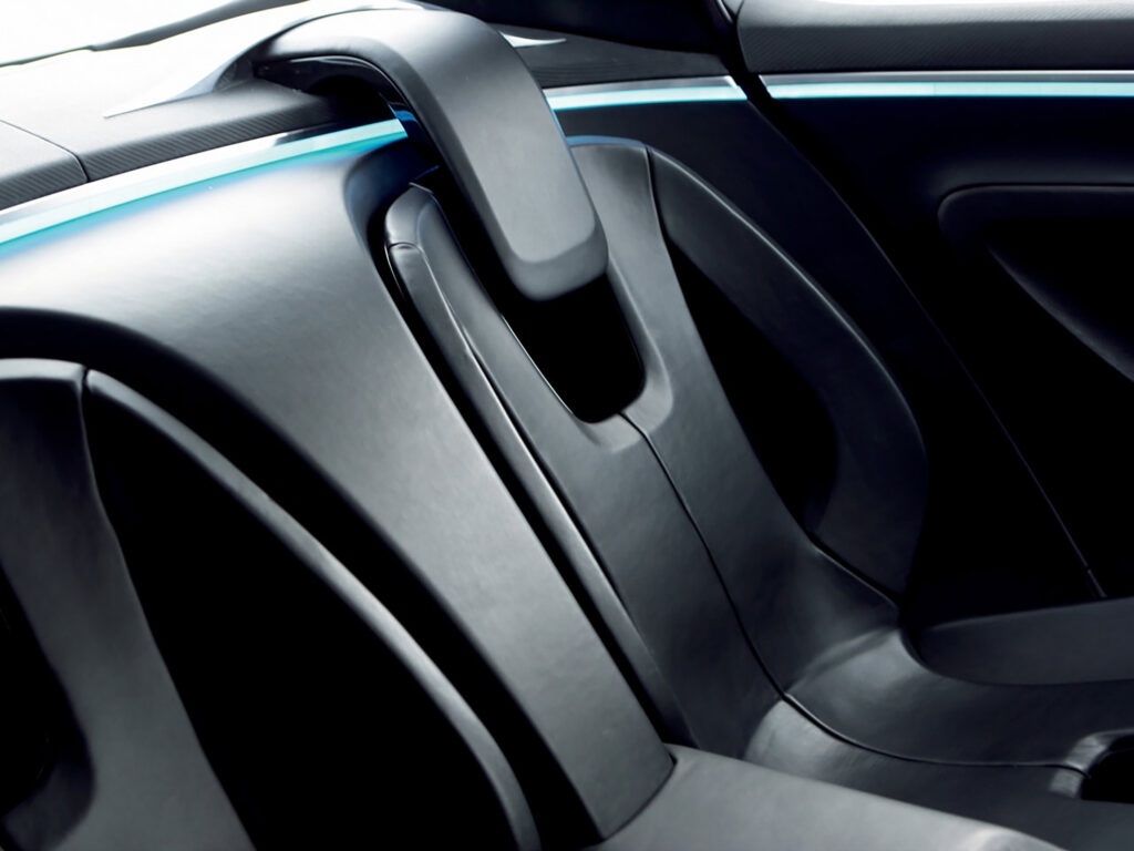 What at first sight may seem to be a simple black interior is actually a sophisticated and contemporary blend of materials including a unique carbonfibre-pattern leather and luxurious semi-aniline leather. Areas of the doors and transmission tunnel have been carved from Poplar wood and then scorched to obtain a rich satin feel. This finish was perfected by artist Clive Sheridan, who produced these beautiful burnt wood forms.