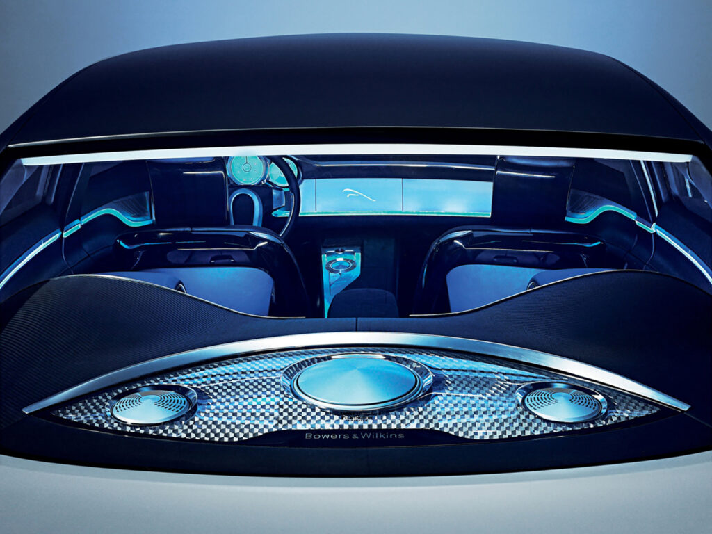 A fifth sensor, located in the facia, responds to the proximity of your hand to reveal an infotainment screen that lies flush within the aluminium front panel. The sequence continues with the centre section of the dashboard rotating 90 degrees to display an advanced Dual View screen which is capable of projecting two different images to the driver and passenger simultaneously. For example, the driver can view satellite-navigation instructions while the passenger watches a DVD-based movie.