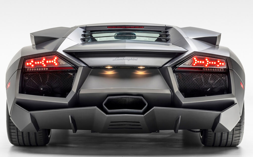 Upon first glance, the Reventon is a strong mix of acute and obtuse angles that mimic the Murcielago lines in a whole new and more frantic way. Both the front intakes and rear cluster surrounds have been extended which give the car a batmobile appearance. The bodywork is limited to a special color called Grey Barra, a near-flat hue that fits with the Reventon’s aeronautical inspirations.