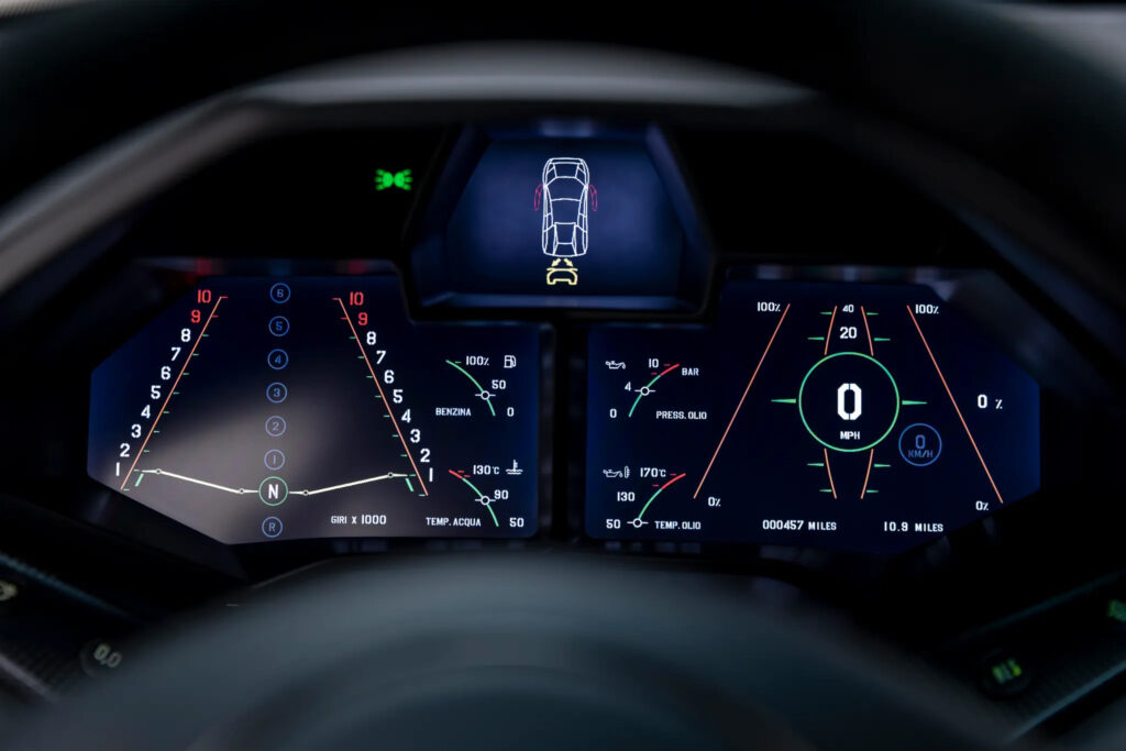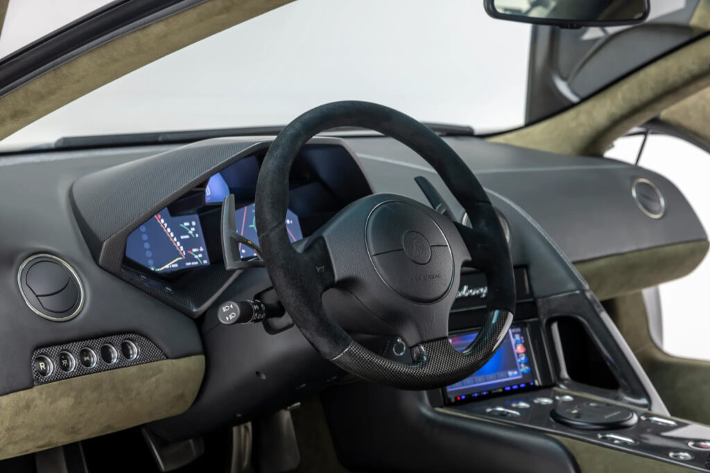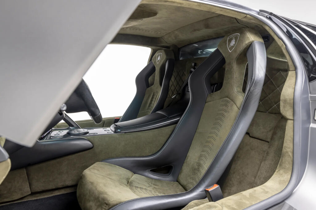 Inside, the cabin is completely new with fighter-plane style gauges and a two-tone Alcantara interior. Lamborghini fit three TFT liquid crystal displays that can replay a multitude of customizable electronic instruments. One is the G-Force-Meter that gives the drive forces, longitudinal acceleration and braking within a topical sphere.