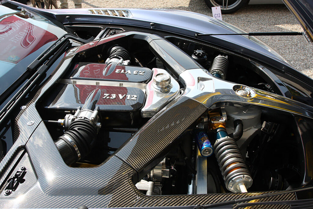 Naturally, such a spectacular chassis demands – and gets – an equally exceptional drivetrain. It comes in the form of an immensely potent 7.3-litre, naturally aspirated V12 engine. Thanks to the adoption of a dry-sump oil system the engine is mounted 100mm lower than in any previous V12-engined Aston Martin road car, which helps keep the One-77’s centre-of-gravity as low as possible. To further aid agility and endow the One-77 with progressive handling and stable, predictable on-limit behaviour, the engine is also mounted 257mm aft relative to the front wheel centreline. In so doing the front-mid-engined layout shared by all of Aston Martin’s current road car range has been taken to a new level.