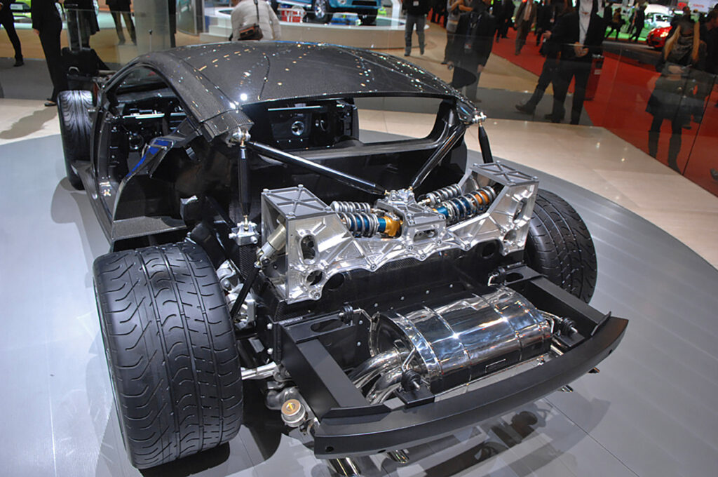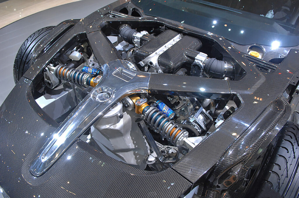 Employing the classic formula of double wishbones at each corner, the One-77 features inboard suspension front and rear, with pushrods employed to transfer vertical suspension movements to the horizontally mounted spring/damper units. A practice taken directly from racing car design, the main advantages of inboard suspension are a reduction in unsprung weight and the ability to package the suspension components more effectively.