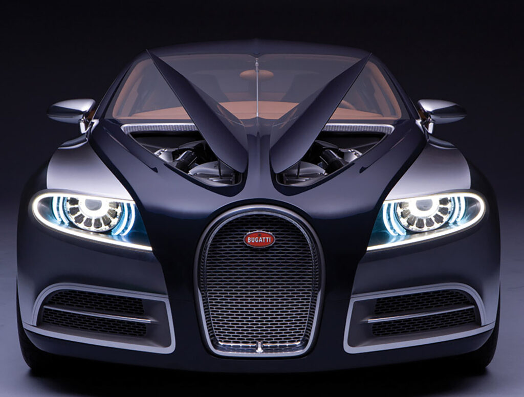 The Bugatti Galibier’s design masters the challenge of uniting sportiness with the comfort and elegance of a modern four-door saloon. The basic architecture picks up on the torpedo-like character of the Type 35, which was already revived in the Bugatti Veyron, and reinterprets it. With the typical Bugatti radiator grille, big round LED headlights and the clamshell running the length of the vehicle which became synonymous with the brand identity under Jean Bugatti in the Type 57, this car transports the Bugatti genes into the modern world.