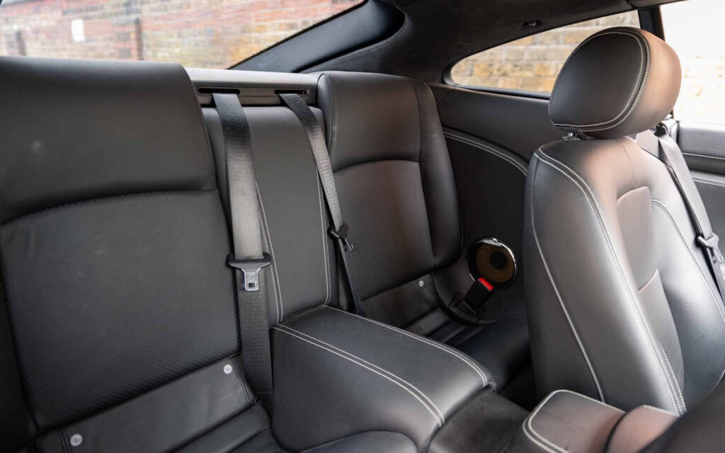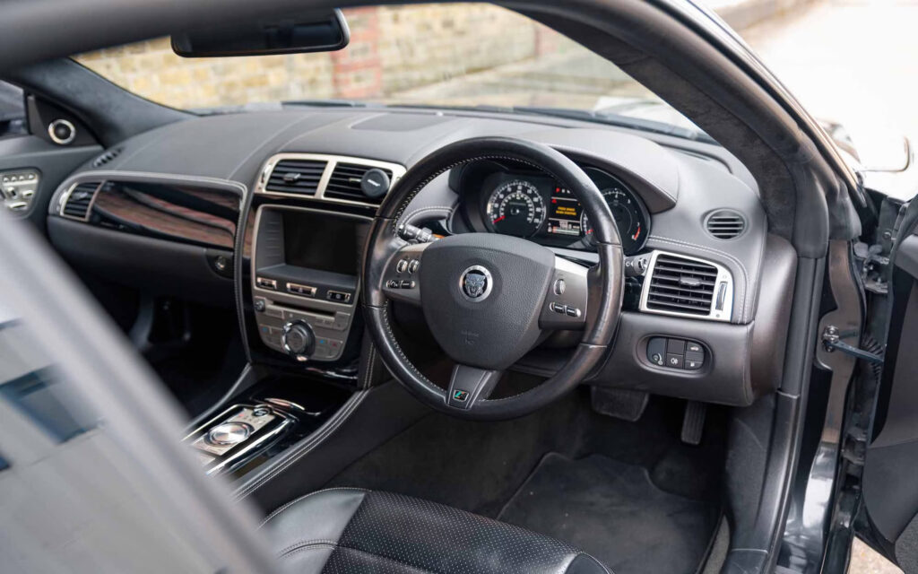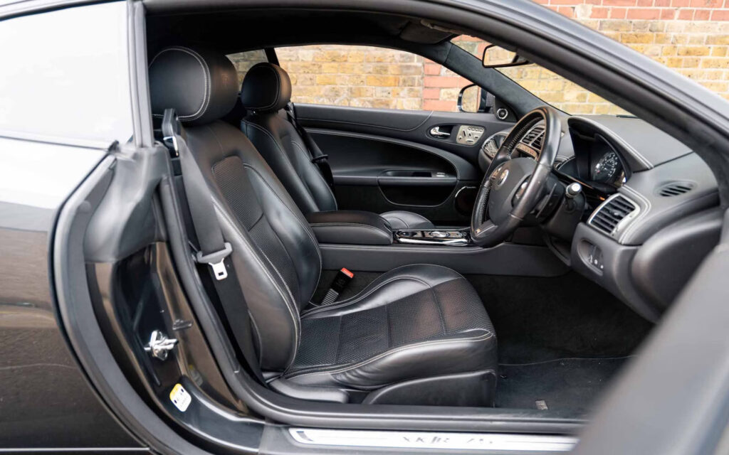 * XKR performance interior in Charcoal and Ivory stitch leather, with Jet suedecloth headlining and XKR 75 tread plate