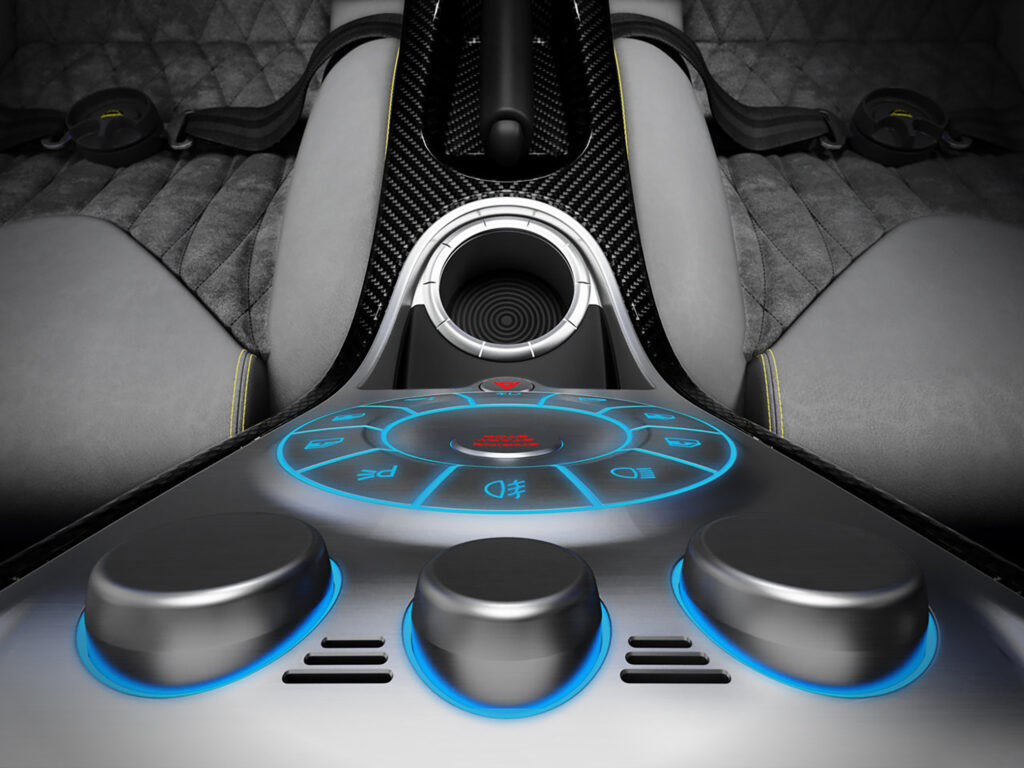 Koenigsegg has also developed a new type of interior illumination, which is a worlds frst in the car industry – Ghost light. The illumination shines through the billet aluminium buttons and surfaces by way of invisible nanotubes, creating excellent visibility of the symbols, as well as a very clean and stylish appearance, framed by an all-new carbon fbre centre console and tunnel assembly.