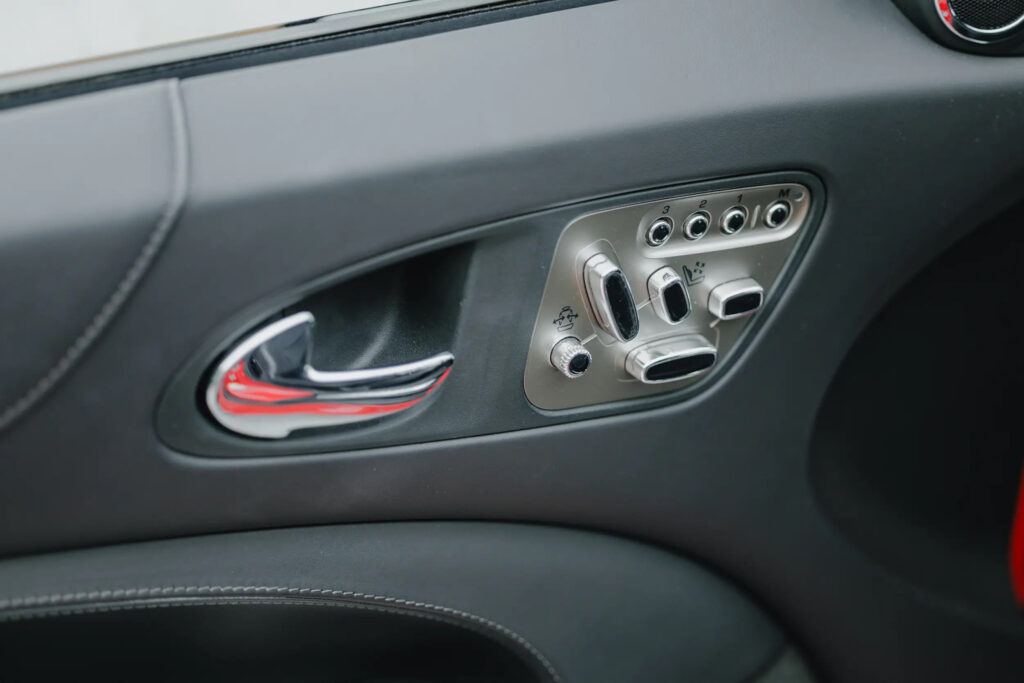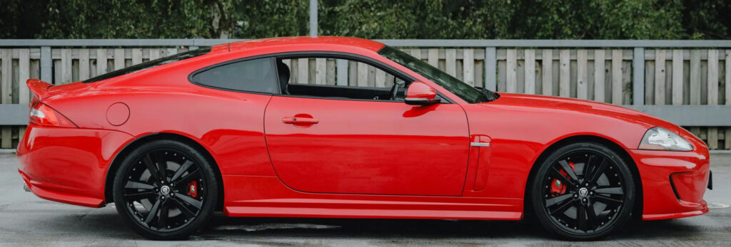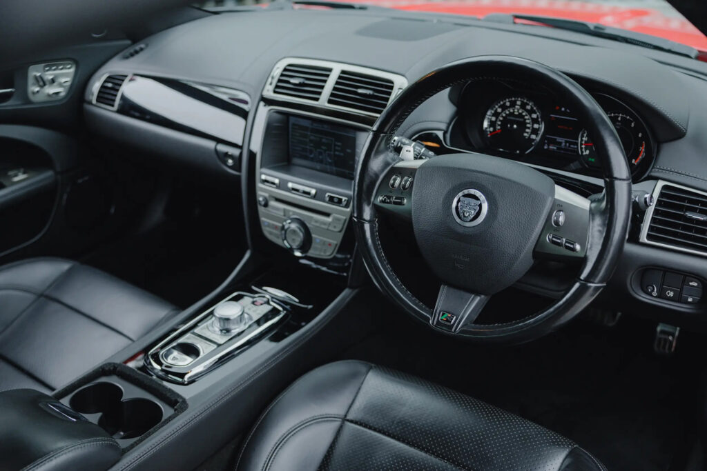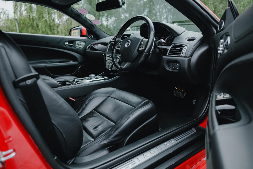 Further gloss black finishing is applied to the window surrounds and front grilles. Red painted brake callipers contrast strongly with the black alloy wheels, while body coloured front and rear spoilers and boot lid finisher round out the package. Customers also have the option to apply a sweeping ‘XKR’ side body graphic that runs along the door sills.