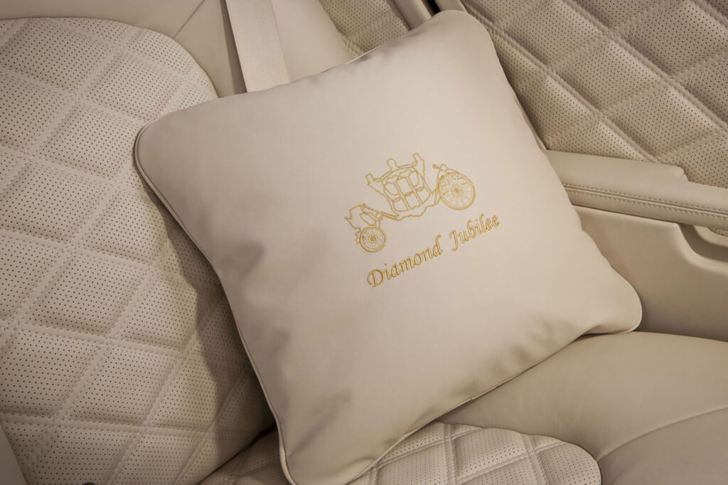 These very special Bentleys are distinguished by a range of exquisite, handcrafted features paying tribute to the Jubilee. These include bespoke embroidery to all four headrests using gold stitching, veneered picnic tables in the rear cabin decorated with a gold overlay depicting a royal carriage used for great occasions of state as well as luxurious, hide cushions featuring the same motif.