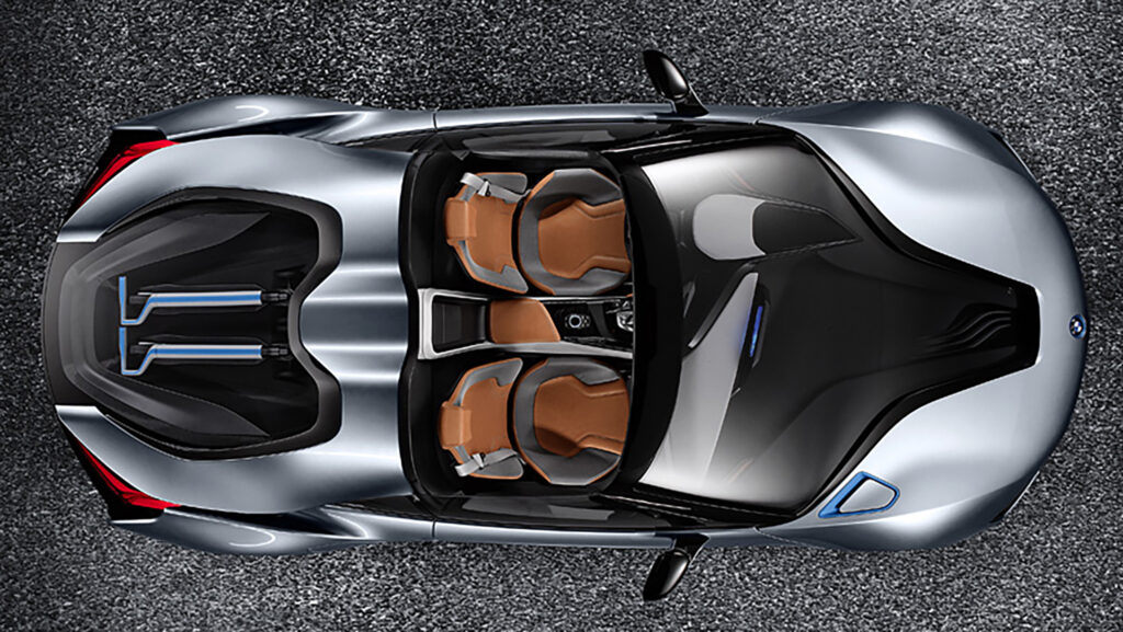 The front end offers a particularly revealing window into the open-top two-seater’s dynamic talent. One defining element is the headlights with pioneering laser light technology, which follow the hallmark BMW i U-shaped design template. A semi-transparent “V” opens out from the front end of the flat bonnet towards the windscreen and beckons the eye to the electric motor below. A spoiler lip positioned on the windscreen frame guides the airflow over the heads of the passengers. And for journeys when the weather cannot quite be trusted, the planned two-section folding roof might well come in handy.