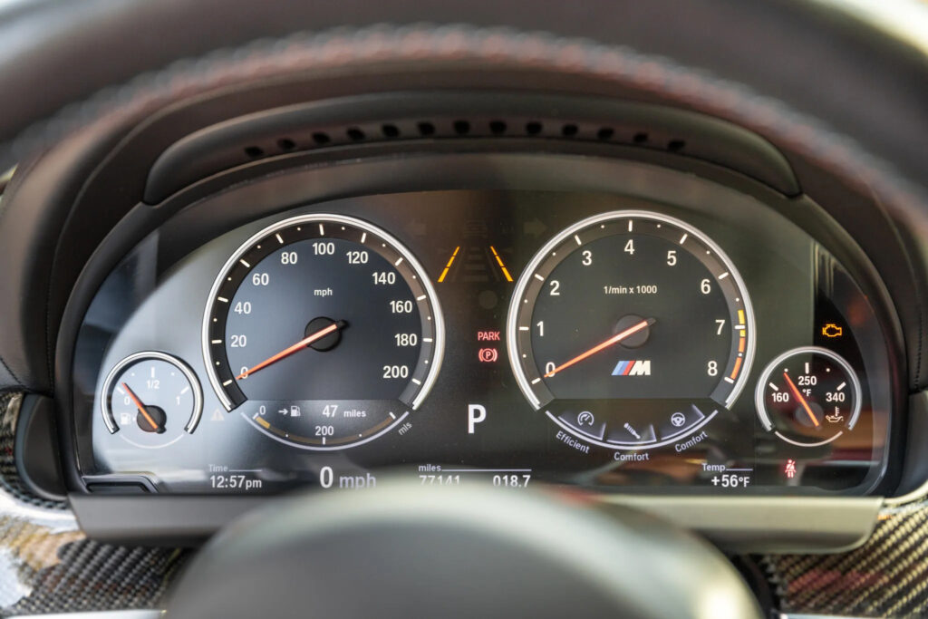 The instrument cluster with black-panel-technology includes classic circular instruments in traditional BMW M car style, with red needles and white illumination, as well as model-specific displays and the M logo on the rev counter. The shift program currently selected and gear engaged are shown in the center of the instrument cluster. Feedback from all the drive and chassis settings selected at the touch a button are also displayed in the instrument cluster under the tachometer.