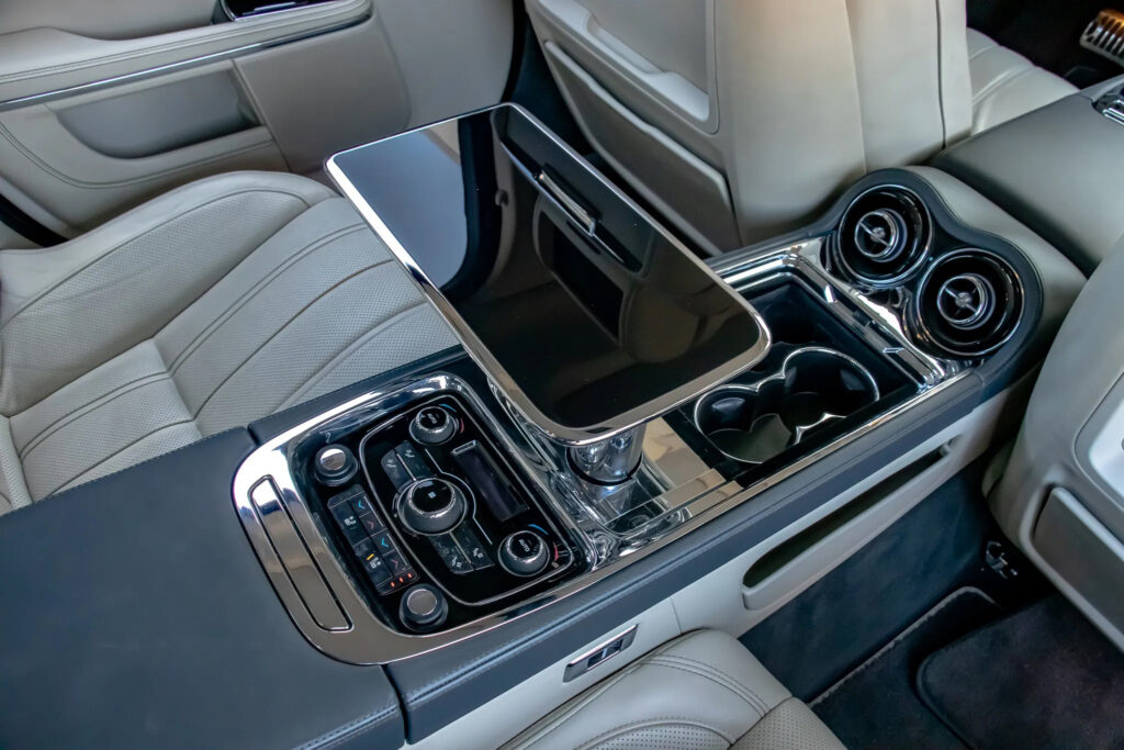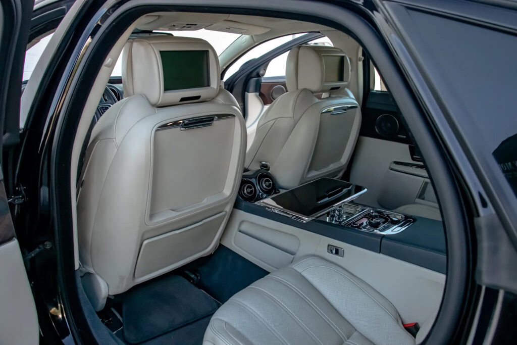 A full-length, leather-trimmed centre console separates the two individually tailored rear seats which feature power adjustment, ventilation, massage and lumbar functions. A table, machined from solid aluminium with piano-black and chrome detailing, rises up from the centre console at the touch of a button to provide a working area, its role supplemented by the provision of two third-generation iPads® with wireless keyboards that are housed in bespoke leather-trimmed docks in the rear of the front seats.