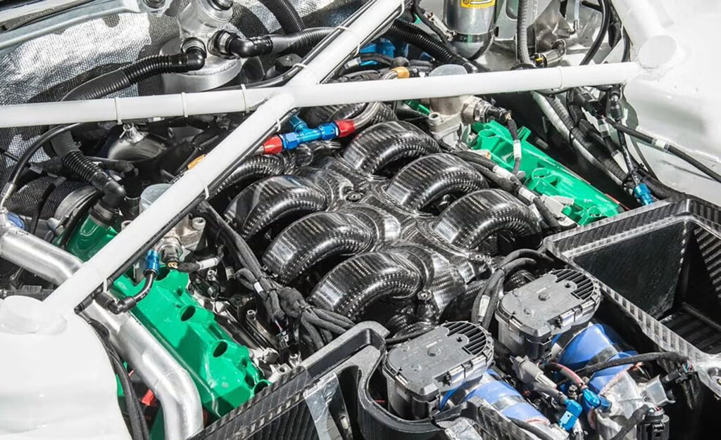 The exterior of the car features a comprehensive aerodynamic package, to maximise downforce with optimised drag. A top-mounted carbon fibre rear wing provides rear downforce and stability, while a carbon fibre splitter balances the aerodynamic forces at the front of the car. Revisions have been made to the bonnet, bumpers, fenders and sills in order to optimise the car’s drag coefficient and to assist with engine cooling.