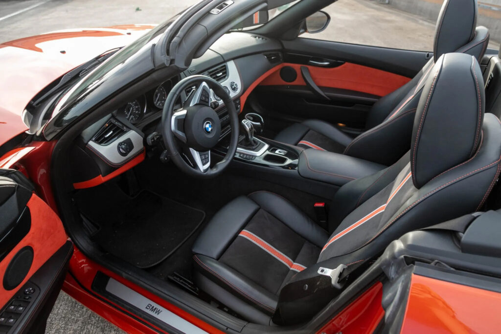 A total of 11 external paint finishes are available for the new BMW Z4, including the new Mineral Grey metallic, Glacier Silver metallic and Valencia Orange metallic, which can only be ordered together with the Hyper Orange package. This new aesthetic/design package lends the Roadster a lively aura; the interior, for example, boasts an energy-charged contrast of black and orange. The bespoke Alcantara door panel trim, like the lower section of the instrument panel, comes in orange. The black leather seats have contrast stitching in Valencia Orange and an accent stripe running down the central section of the backrests and seat cushions. This stripe is likewise orange and is flanked by two thin white lines. The door panel trim and lower section of the instrument panel can also be specified in black as an option. Another exclusive element of the Hyper Orange package is the metal weave trim strip, which can be combined with further decorative elements in high-gloss black for the door openers and the gearshift or selector lever. This new Design package replaces the previously available Citrus Yellow Package and is also available in combination with other exterior paint colors as an option.