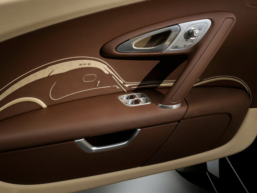The intricate, particularly eye-catching embroidery on the doors and the cover of the rear storage compartment once again harks back to the vehicle’s legendary predecessor, given that the side silhouette of the Type 57SC was embroidered onto the chocolate brown doors using contrasting beige silk thread. From a bird’s eye view, the Atlantic’s silhouette is immortalised using brown thread for decorative stitching on the rear beige-coloured storage compartment.