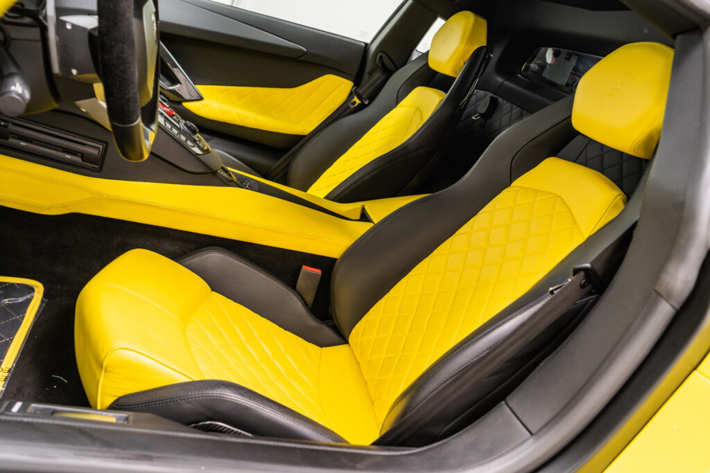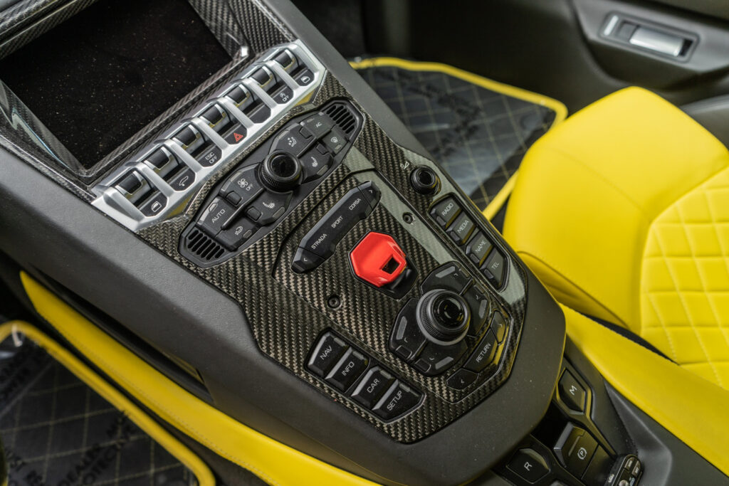 The interior of the Aventador LP 720-4 50° Anniversario is upholstered in an extremely fine, natural, semi-aniline leather. This leather, specifically developed for the Aventador 50° Anniversario, is worked through a particular tanning and coloring process that accentuates the full grain, natural look and smoothness of the leather. The colors offered are inspired by Lamborghini’s home in the Italian region of Emilia-Romagna. Thus, Nero Ade (black) is combined with Terra Emilia, a shade of brown evoking the earth of the region, a color that evaluates the exclusive positioning of this model. An alternative color is Giallo Quercus, a yellow color matching the exterior and stressing the vehicle’s sporty nature, is named for the yellow oak tree in the Sant’Agata Bolognese coat of arms. Featured in both versions is the exclusive Q-Citura stitch, a diamond pattern introduced especially for this celebratory model that highlights the Italian craftsmanship found in the interior of the Aventador 50° Anniversario.