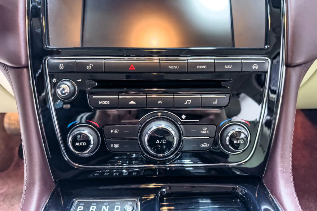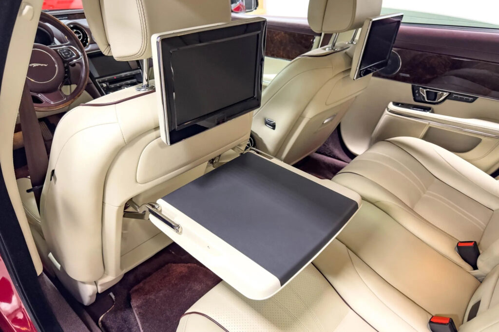 Rear-seat passengers in the LWB version of the 2014 XJ are provided with a wide range of entertainment features. The Rear Seat Entertainment package comprises two 10.2″ high-resolution screens mounted on the back of the front seat headrests. These can display inputs from a number of sources; the DVD player, digital TV tuner or an external media player that can be synced through the Rear Media Interface, which provides USB and RCA connections. Audio can be transmitted through the wireless headphones, allowing each passenger to watch separate entertainment sources. The rear seat environment, including the entertainment, is managed by a wireless controller housed in the centre console which also allows passengers to alter their individual climate zones and seat heating and cooling functions.