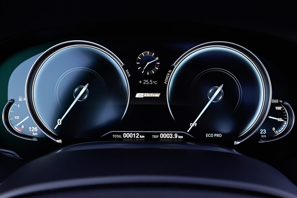 The eDrive button on the centre console lets the driver adjust the hybrid drive’s operating mode. In the AUTO eDrive basic setting, the engine’s power is boosted to notable effect by the electric drive when accelerating or during quick bursts of speed. With the MAX eDrive mode engaged, meanwhile, the BMW 740e and the BMW 740Le are able to run purely on electric power, meaning zero local emissions, at speeds of up to 120km/h (75mph) and for a maximum range of 40 kilometres (25 miles, BMW 740Le xDrive: 37 km / 23 miles).